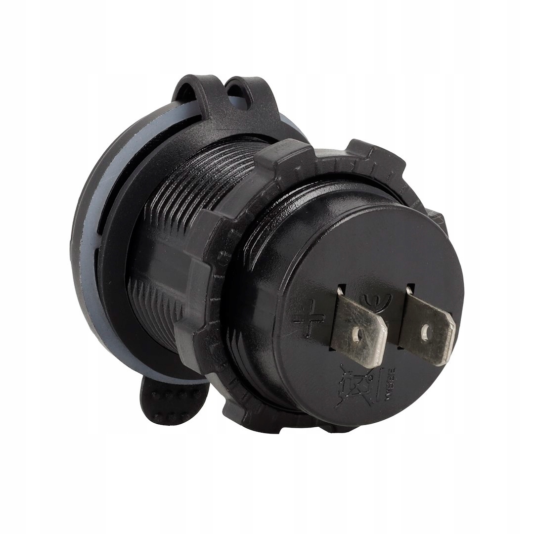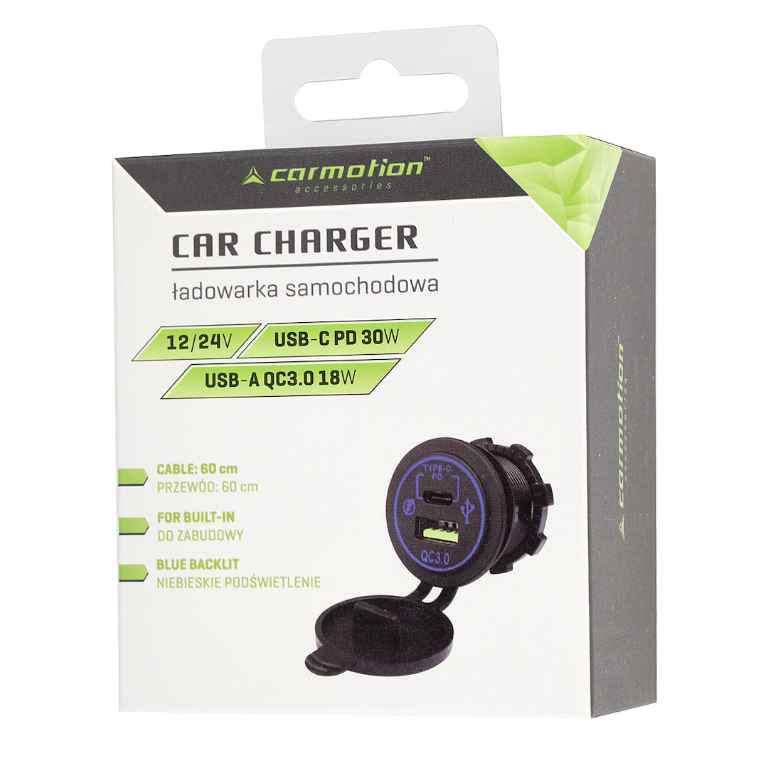 Вбудований автомобільний зарядний пристрій із кабелем живлення, оснащений роз’ємом USB QC3.0 максимум 18 Вт і USB-C PD максимум 30 Вт. Універсальний для установок 12В і 24В постійного струму. Встановлення в отвір діаметром 30 мм, зроблений напр. в панелі приладів або оббивці. Цей зарядний пристрій ідеально підходить для мотоциклів, скутерів, квадроциклів, легкових автомобілів, мікроавтобусів і човнів. Його розроблено для роботи в несприятливих погодних умовах завдяки водонепроникному гумовому ковпаку.