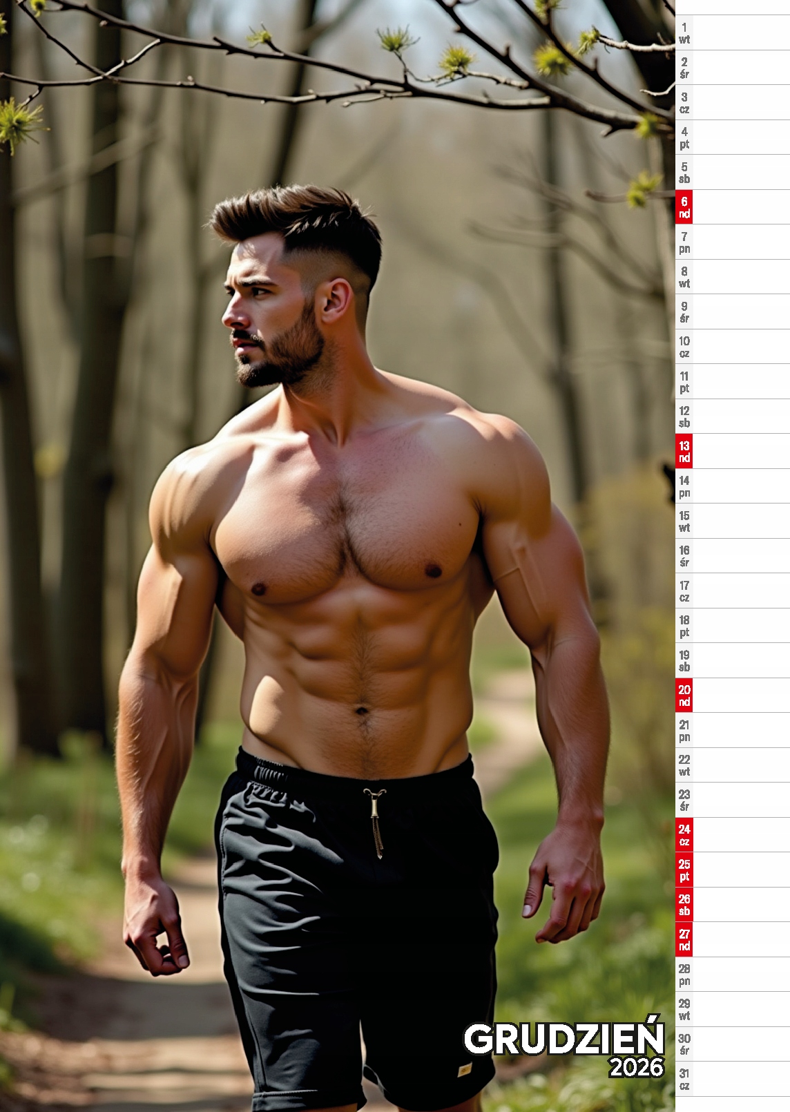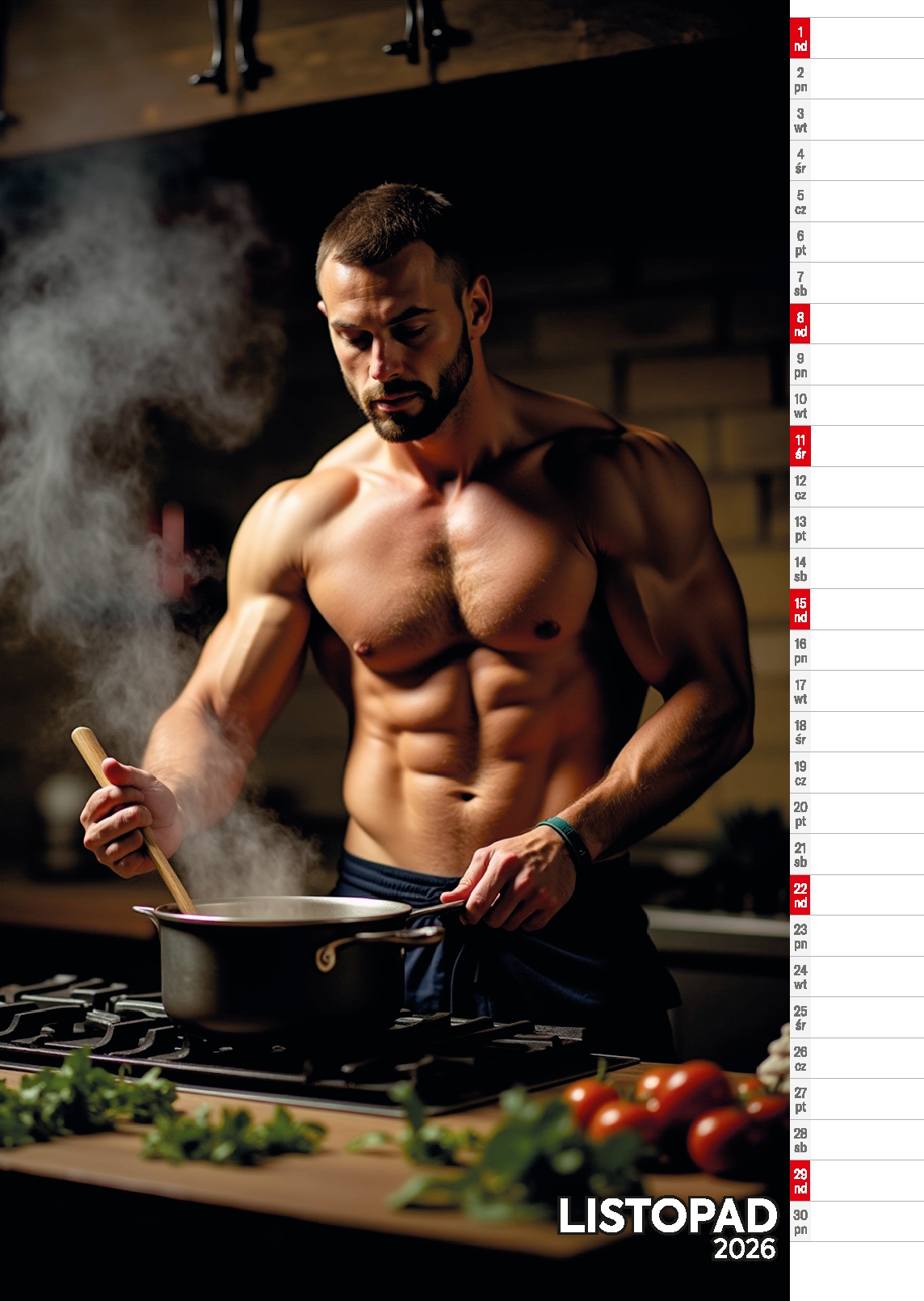 Цей ексклюзивний настінний календар чоловіки 2026 - це поєднання елегантності, чуттєвості та високої якості друку. Щомісяця представляє різну, атлетичну модель у кліматичних декораціях - від теплого багаття до зимового вечора, до літніх садових робочих або кухонних натхнення.