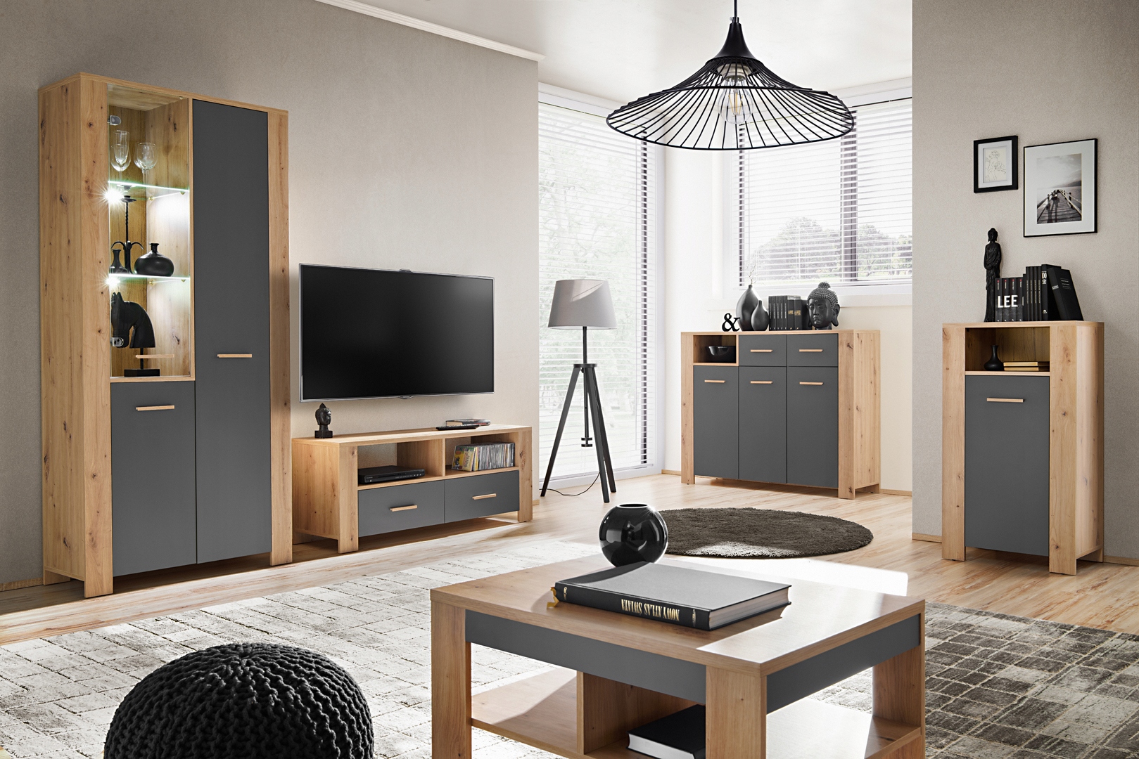 Колекція представлена в модних кольорах, які поєднують дерев'яний корпус з графітовим фронтом.