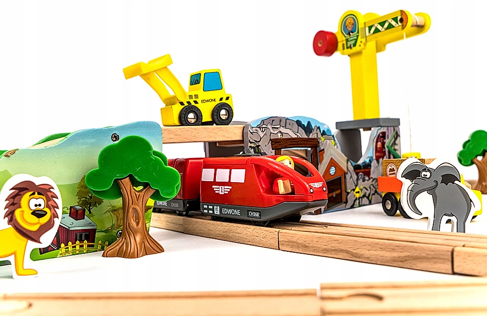 Набір виготовлено дуже ретельно, з увагою до найменших деталей. Ергономічна форма дозволяє легко тримати маленькими ручками. Виготовлені з дерева, вони ідеально чистяться та поліруються. Немає плям, сучків і сколів. Деякі елементи, як-от дерева та локомотив із вагонами, виготовлені з високоякісного пластику.