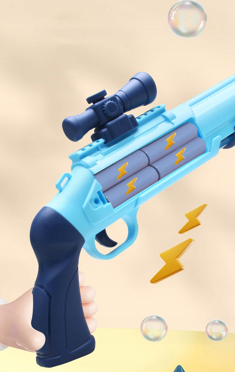 Рушниця працює повністю автоматично. Просто помістіть пляшку з рідиною всередину, і рушниця почне стріляти. Тисніть на курок у будь-який момент і милуйтеся чудовими бульбашками! Зброя також буде чудовою для заходів!