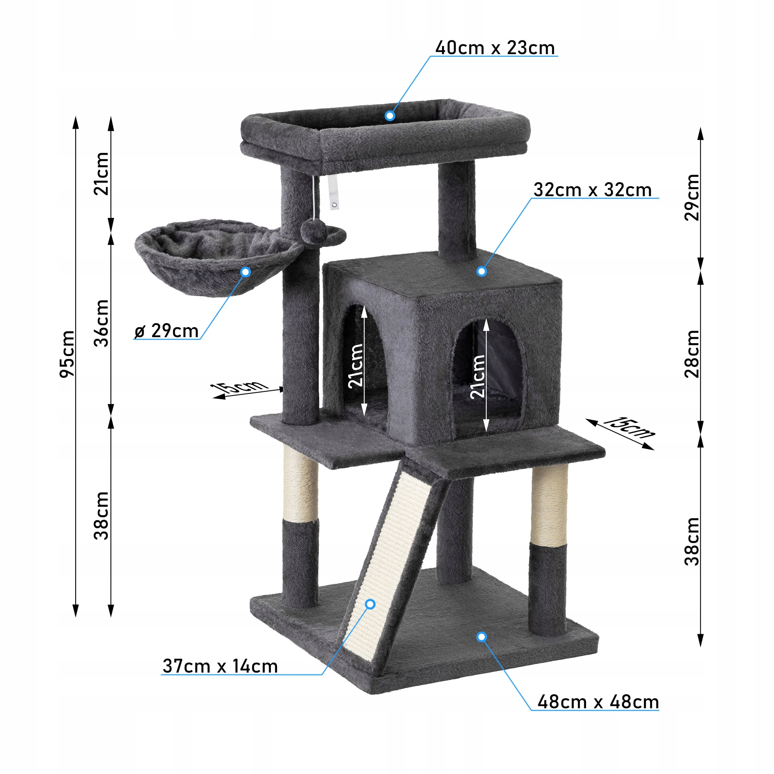 - Багаторівнева структура : котяче дерево складається з декількох рівнів для гри та відпочинку. Ваша кішка матиме просторе лігво на вершині, пандус з кігтів, грає в м'яч, зручні підйомні полиці, затишний гамак для відпочинку та кабінка, щоб сховатися.