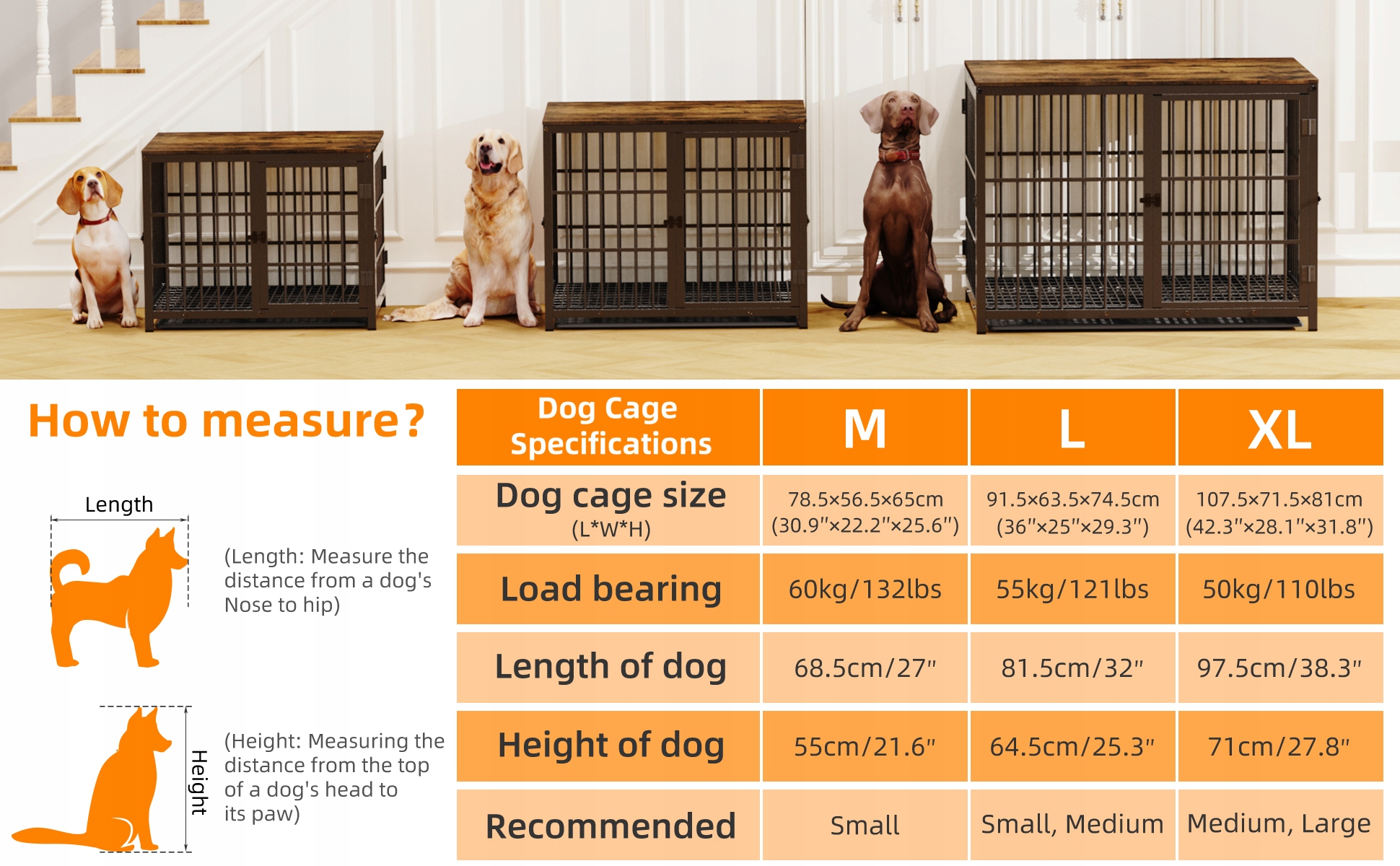 Довговічний розплідник для собак: ящик для домашніх тварин добре виготовлений із товстішого важкого металевого дроту, який має високу міцність і довговічність, ніж тонкий дріт, стійкий до деформації та руйнування, закруглені залізні труби більш стійкі до укусів ніж тонка, верхня частина виготовлена з твердої МДФ плити з красивим деревним зерном, витримує вагу 50 кг, поверхню фарбується на водній основі, легко витирається.