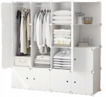 Модульна шафа-купе, що складається з елементів ПВХ, посилених металевим каркасом. Стінки гардеробу з'єднані кутами.