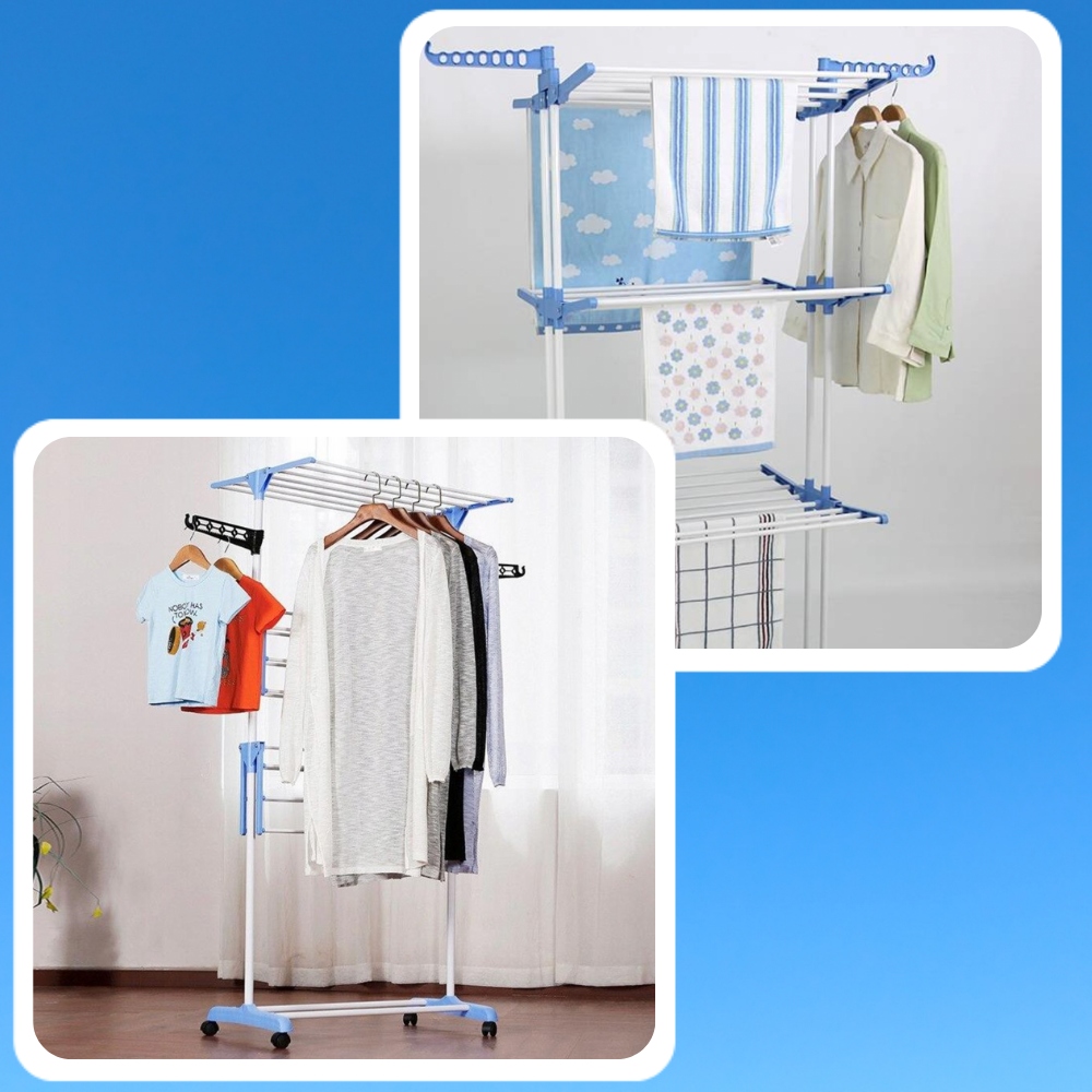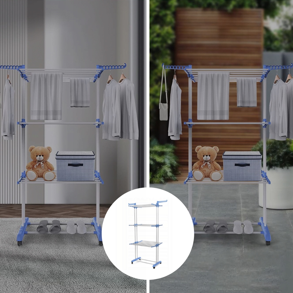 Вертикальна 3-рівнева окремо стояча сушарка для білизни. Завдяки коліщаткам він дуже мобільний, ми можемо легко і швидко переносити його з одного місця на інше. Крім того, колеса мають блокування, тож ми можемо бути впевнені, що сушильна машина буде стійкою та не зрушиться під час поривів вітру чи протягу.