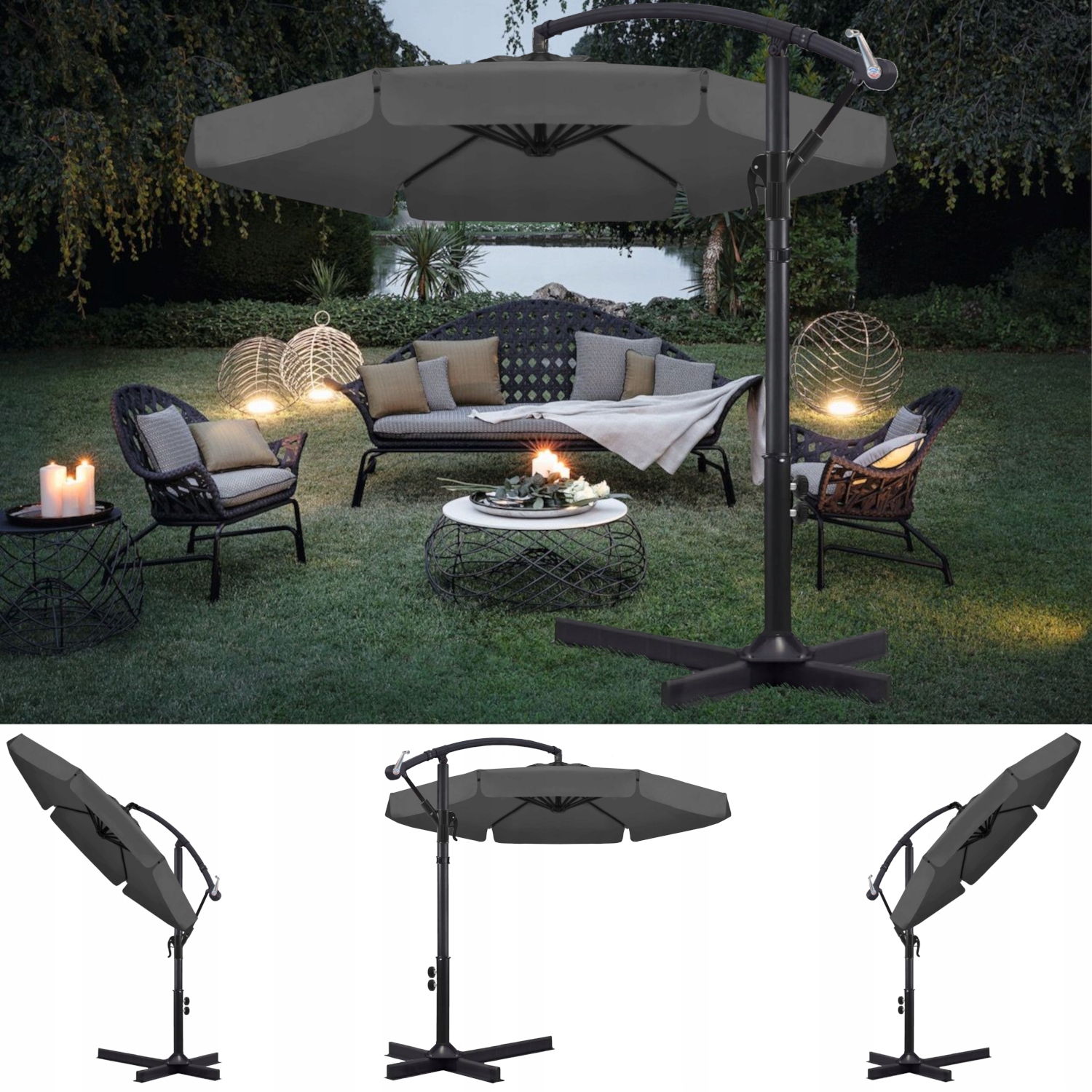 парасолька з бумом чудово працює як затінення навіть над дуже обширними наборами садових меблів, на терасах, балконах або просто в кутку на ділянці.