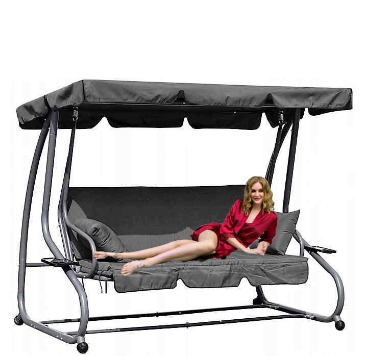 Садова гойдалка обладнана з великим, регульованим навісомякий захистить нас від шкідливого ультрафіолетового випромінювання та створить приємну тінь у спекотні дні. Зручний, м'який матрац товщиною 8 см і дві подушки, які кріпляться, зроблять ваше перебування приємнішим у будь-який час. Завдяки можливості швидко перетворити гойдалку на шезлонг, ми можемо ідеально адаптувати її до наших потреб. Вся гойдалка виготовлена зі сталі з порошковим покриттям, а також пластикові захисти по кутах основи , що забезпечують стійкість під час розгойдування.