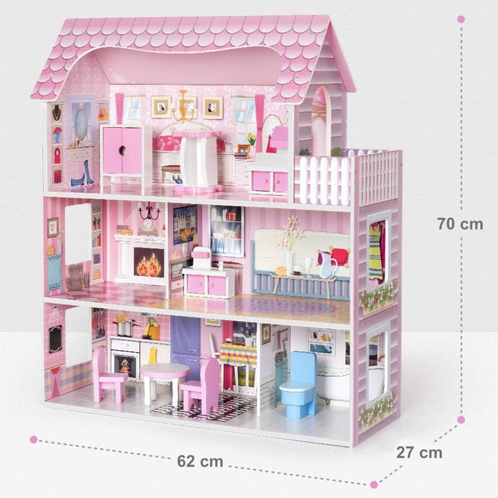 Цей дерев’яний ляльковий будинок - дивовижна іграшка, яка, безумовно, радує кожного маленького шанувальника веселощів у "будинку". Його високоякісна майстерність, увага до деталей та різноманітність кімнат стимулюють творчість та стимулюють уяву дитини, що дозволяє необмежено задоволення відповідно до власних сценаріїв.