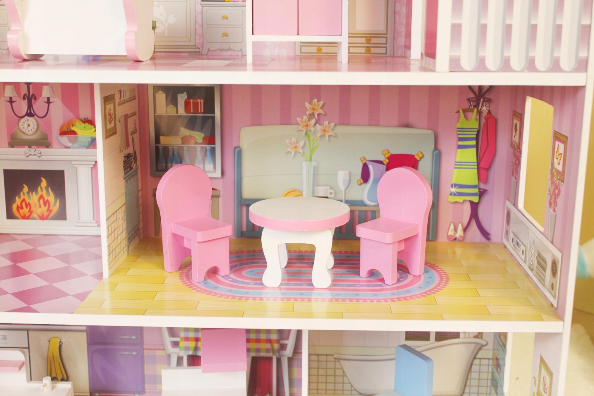 Чудовий 3-поверховий дерев'яний ляльковий будиночок з меблями і терасою був створений з великою увагою до кожної деталі. Має 5 великих і просторих кімнат і вихід на терасу. Дерев'яні меблі та аксесуари рухливі і їх можна переміщати в будь-яке місце залежно від фантазії дитини. Будинок має три незалежні рівні, загалом 5 кімнат + тераса, і кожна з них має різний стиль (спальня, їдальня, кухня, ванна кімната, вітальня). Це неодмінно порадує вашу дитину та забезпечить довгі години чудового задоволення. Будинок абсолютно безпечний і стабільний. Ідеально вписується в будь-який інтер'єр.