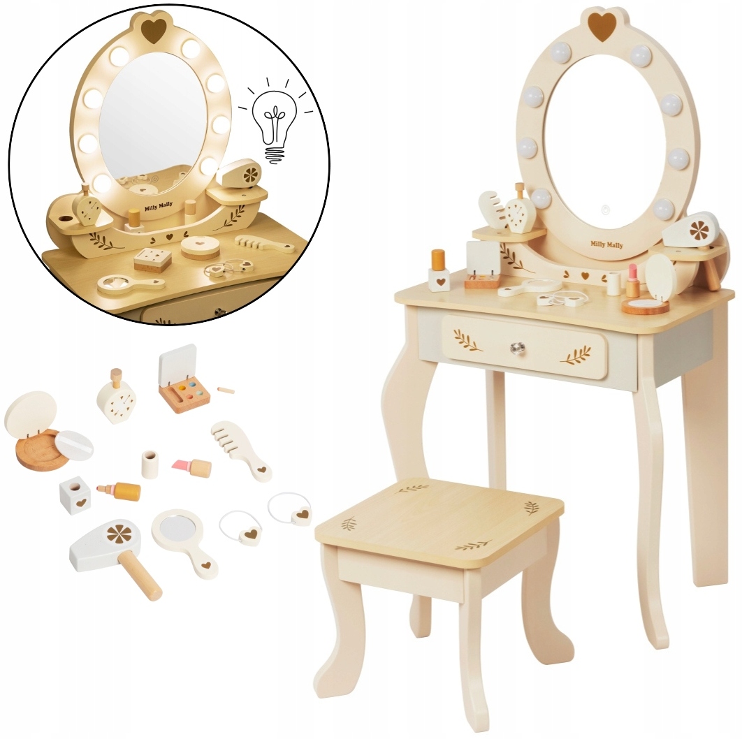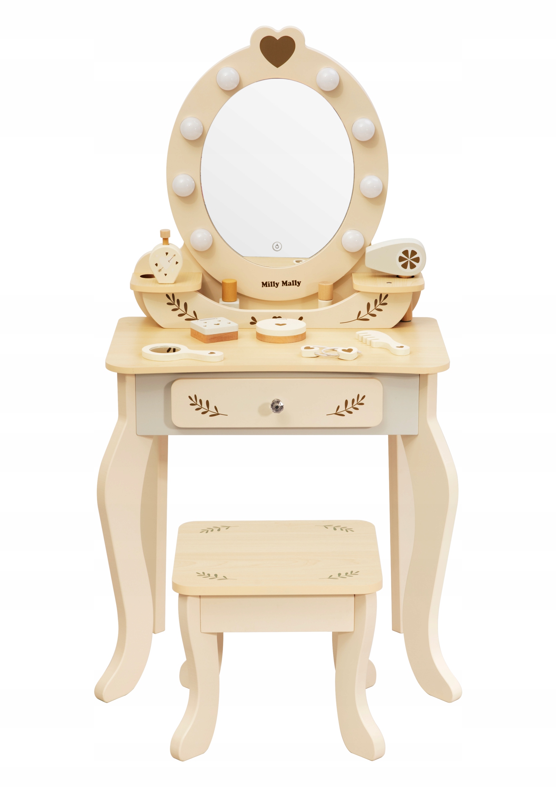 ✅ ВЕЛИКИЙ ДЕРЕВ'ЯНИЙ ТУАЛЕТНИЙ СТОЛИК ELLY - ПРОФЕСІЙНИЙ КУТОЧОК КРАСИ ЗІ СВІТЛОДІОДНИМ ОСВІТЛЕННЯМ! ✅ ⭐️ Здійсніть мрії вашої маленької принцеси про власний елегантний куточок краси з туалетним столиком Elly від відомого бренду Milly Маллі. Це не просто іграшка, а стильний предмет меблів з міцної деревини та плити МДФ, який стане справжньою окрасою дитячої кімнати, даруючи спокій та гармонію завдяки своїм пастельним, збалансованим кольорам. Туалетний столик призначений для розвитку уяви та творчих здібностей, а гра в наслідування дорослим підтримує соціальний розвиток і формує у дитини почуття незалежності. Сьогодні дайте своїй малечі безпечний простір для розвитку своєї пристрасті.