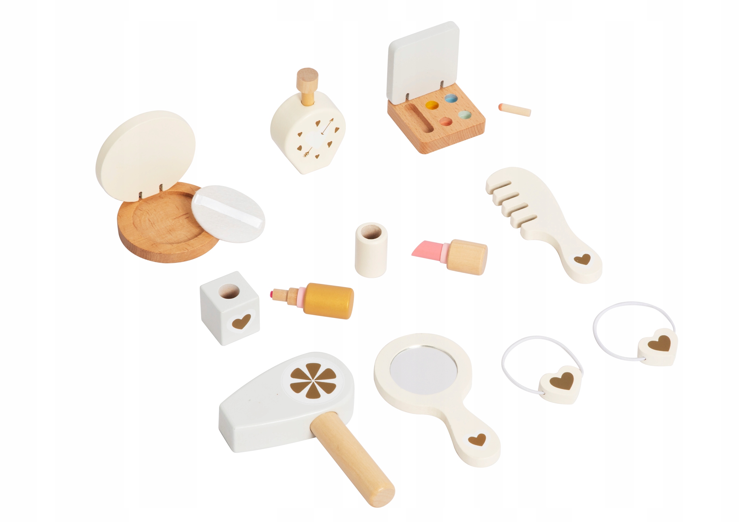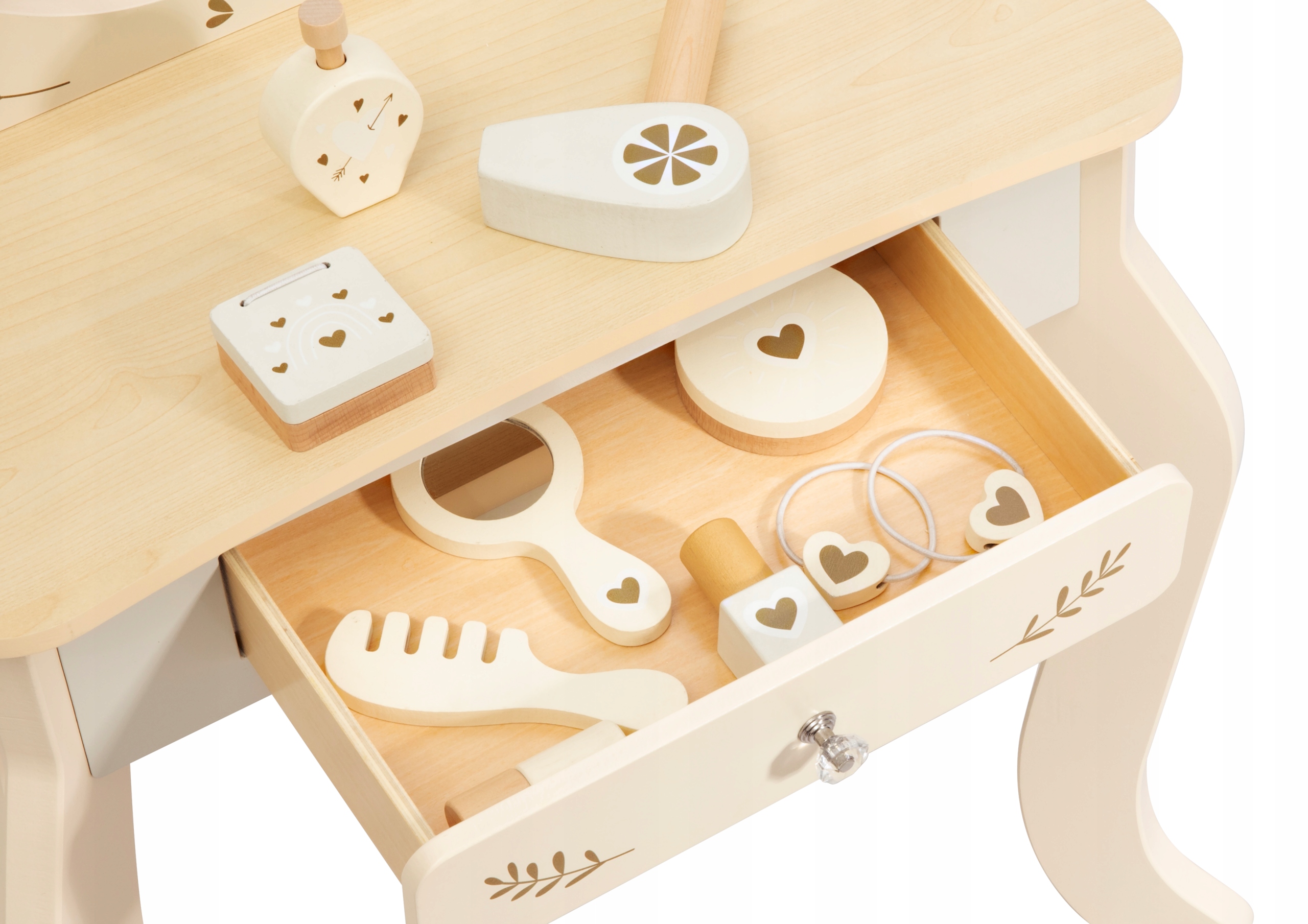 ✅ БАГАТИЙ НАБІР ДЕРЕВ'ЯНИХ АКСЕСУАРІВ - БЕЗПЕЧНЕ РОЗВАГА від догляду! ✅ ⭐️ Туалетний столик Elly повністю укомплектований і готовий до гри відразу після складання, завдяки багатому набору дерев'яних аксесуарів для макіяжу та догляду! У набір входять відкриті імітації помади, лаку для нігтів і палетка тіней з аплікатором, фен, гребінець і духи з рухомою кнопкою. Всі елементи виготовлені з безпечної деревини, без гострих країв і пофарбовані нетоксичними фарбами. Цей набір розвиває ручні навички, вчить точним рухам і дає змогу годинами займатися творчою безпечною укладкою.