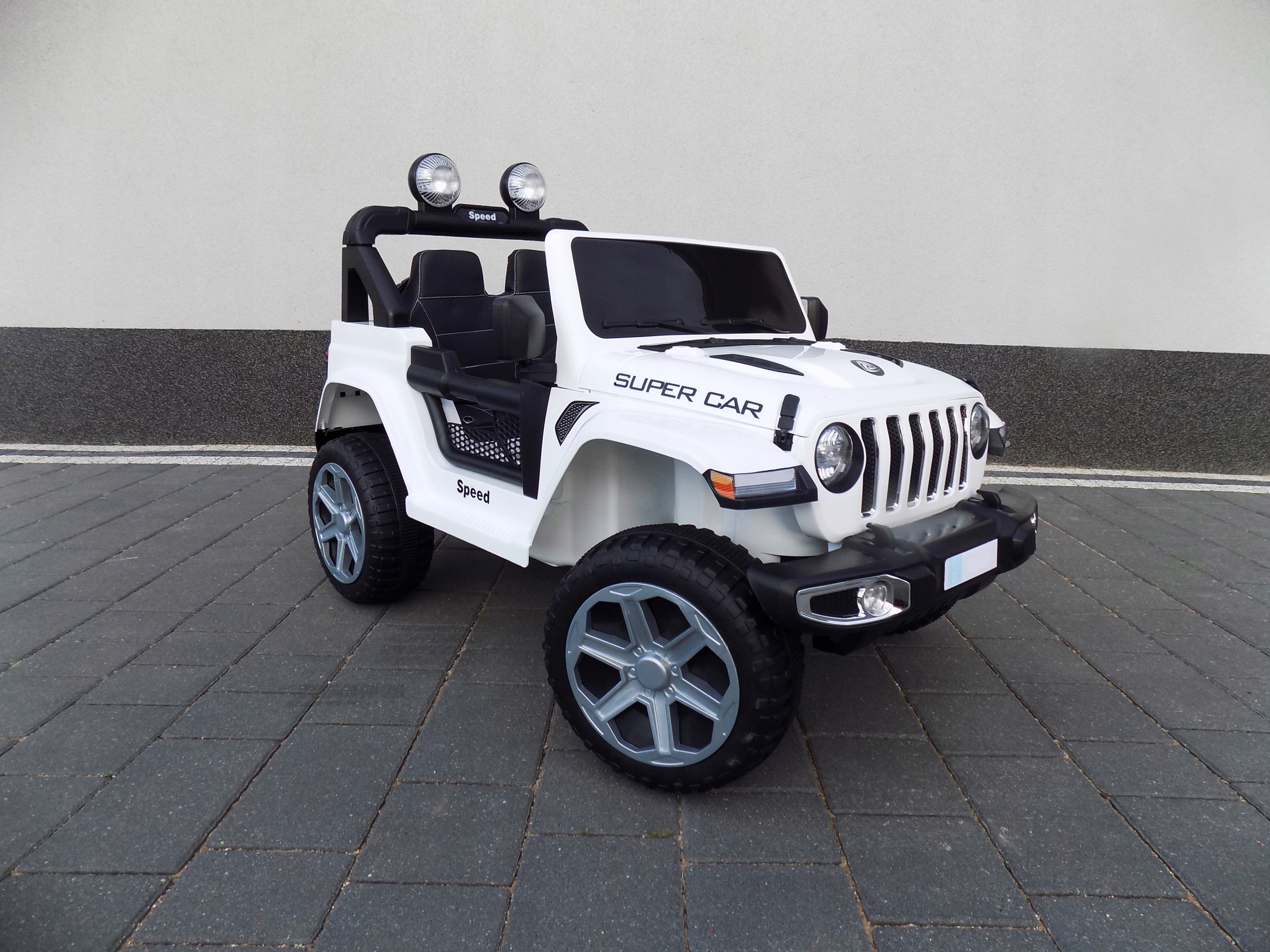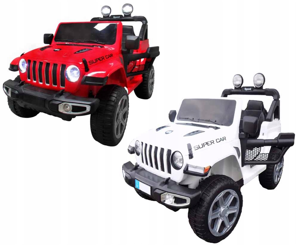 JEEP 4X4 на 12 В з повним приводом порадує багатьох майбутніх водіїв. Завдяки використанню 4 двигунів, кожен по 35 Вт, автомобіль без проблем їздить по нерівній місцевості.