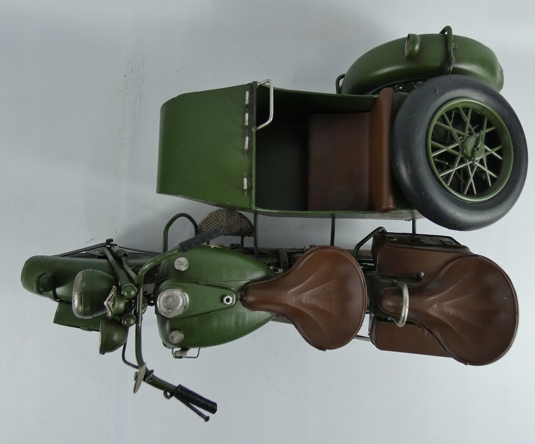 Тема мого аукціону - це металевий військовий мотоцикл з кошиком.