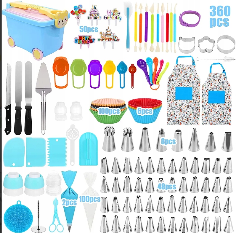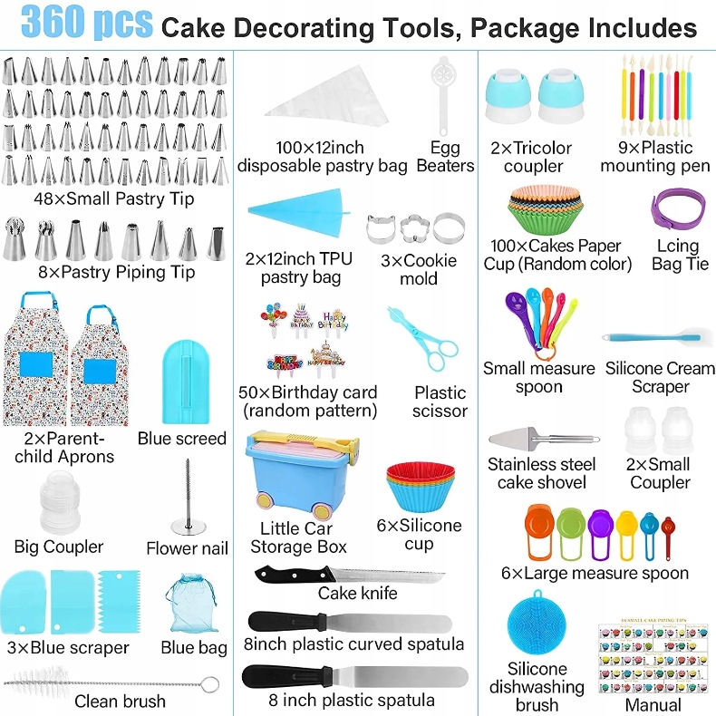 ✅ Набір для прикраси торта на 360 предметів: містить невелику коробку для зберігання в машині, фартухи для батьків і дітей, 48 маленьких наконечників для торта, 8 наконечників для торта, пакети з ТПУ, 100 одноразових пакетів для кондитерських виробів. , краватка для сумки для глазурі, великий і малий клатч, триколірний клатч, пластикова глазур і вигнута лопатка, ніж і лопатка для торта, 3 синіх скребка, скребок для торта, силіконова лопатка.