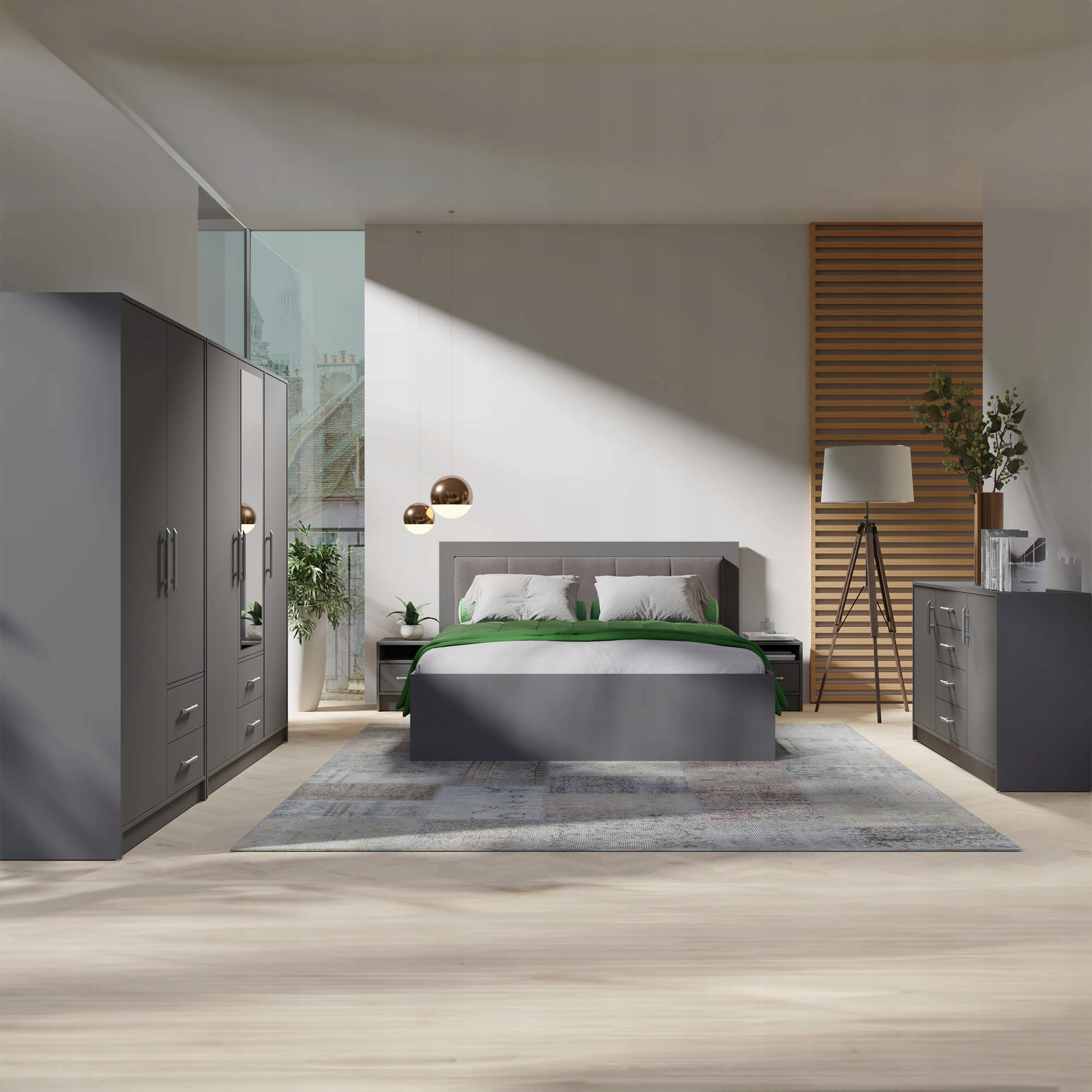 Комплект меблів для спальні ARTOS I - комплексне рішення, яке гармонійно вписується в облаштування спального простору. У нього входять тридверна шафа з дзеркальними дверцятами, дводверна шафа з практичними ящиками, комод з чотирма місткими ящиками і двома функціональними шафами, а також дві стильні тумбочки. Все це доповнюється двоспальним ліжком розміром 160х200 см, що забезпечує комфортний сон. Цей комплект відрізняється не тільки елегантністю, але і практичністю. Велика кількість простору для зберігання, яку він пропонує, дозволяє підтримувати порядок у вашій спальні та в той же час дозволяє зберігати різні речі в одному місці. Це не лише естетичне, але й функціональне рішення, яке полегшує повсякденне життя.