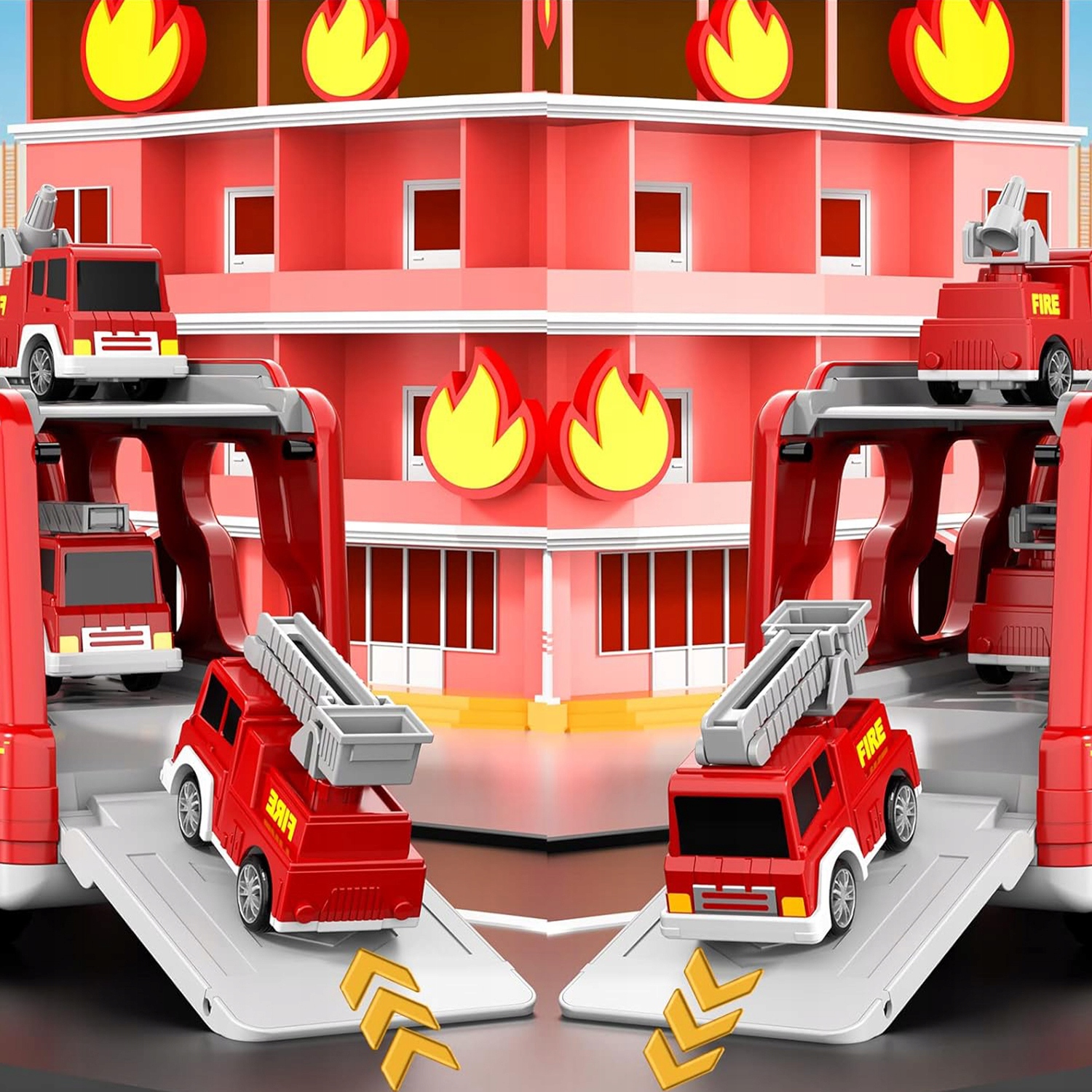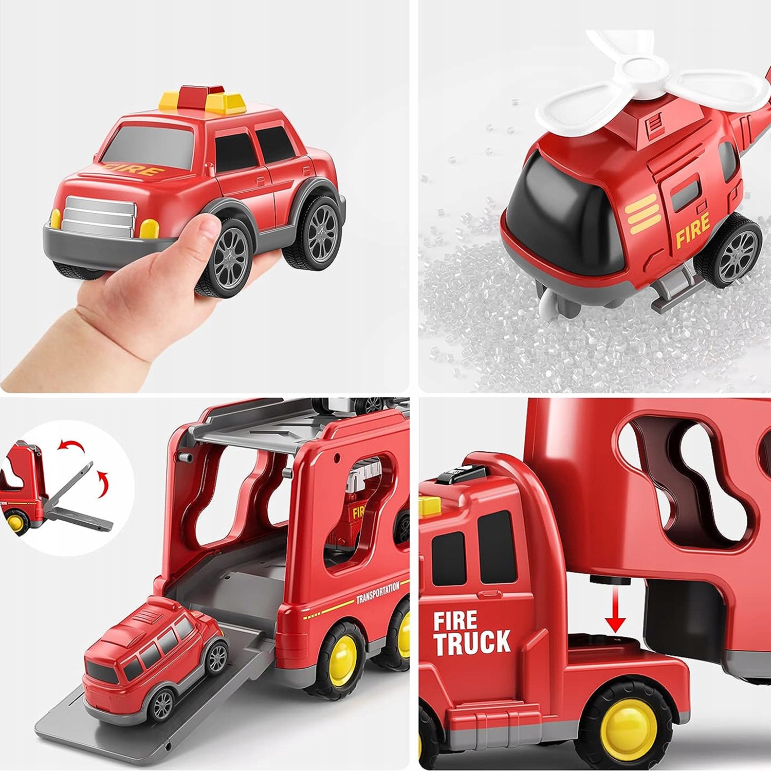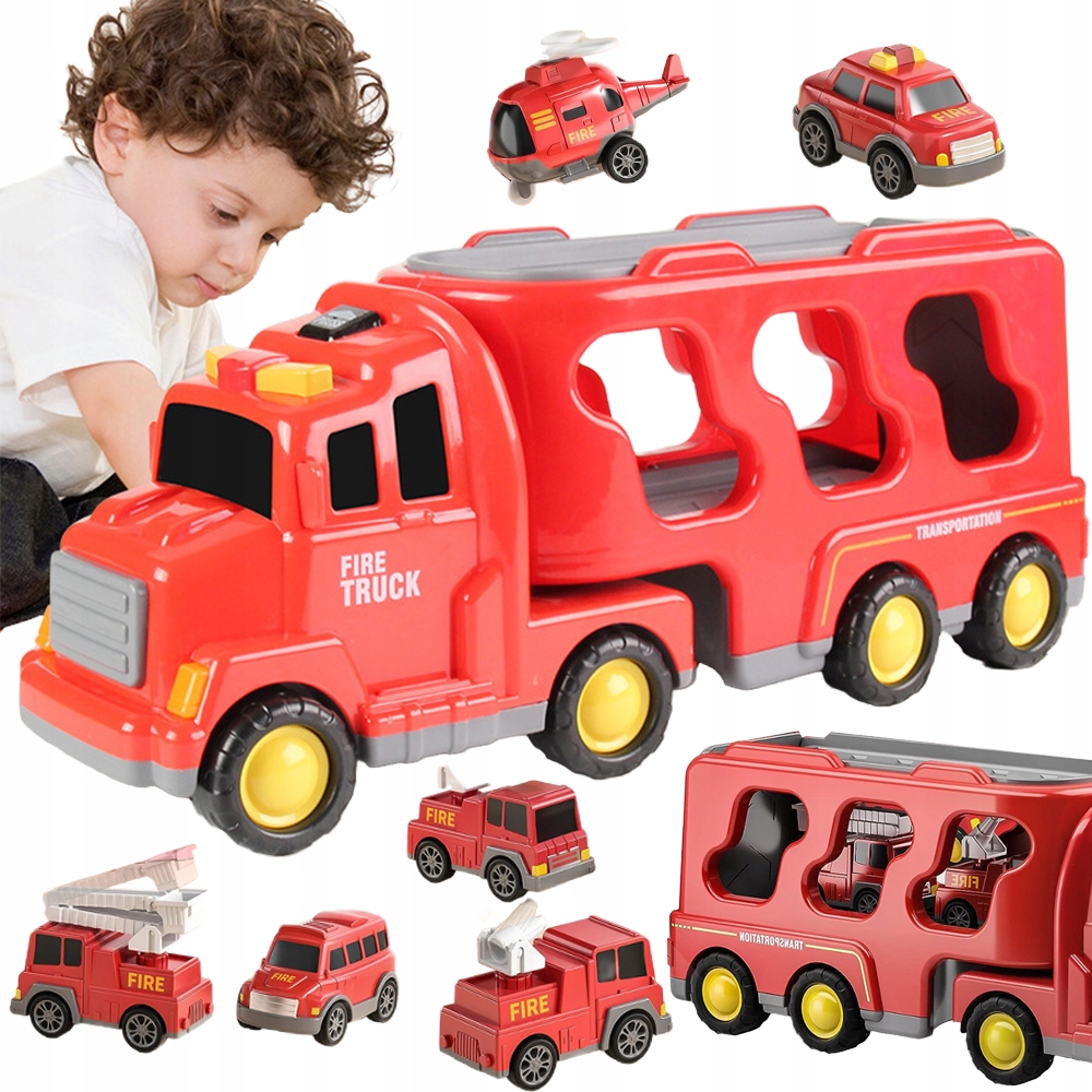 - Створено для маленьких любителів пожежі, включає велику транспортну вантажівку та 6 менших транспортних засобів (пожежну машину, автодрабину, гелікоптер, спринклер, автомобіль і позашляховик).