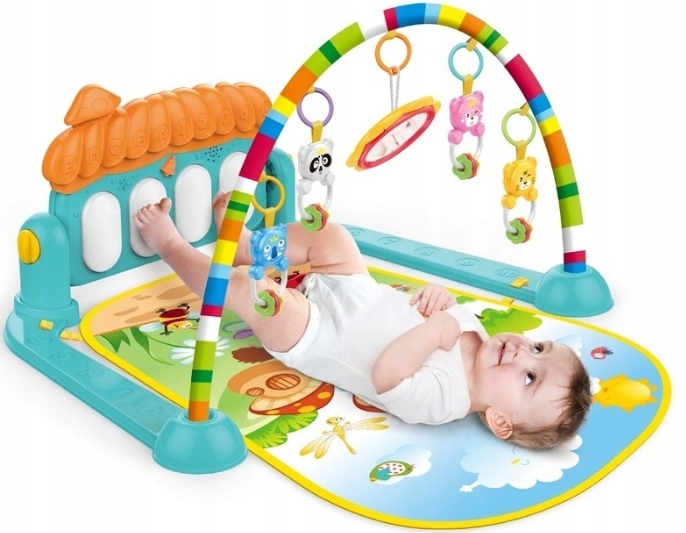 - Коли малюк лежить на спині, він грає з іграшками, одночасно вдаряючи ніжками по клавішах піаніно.