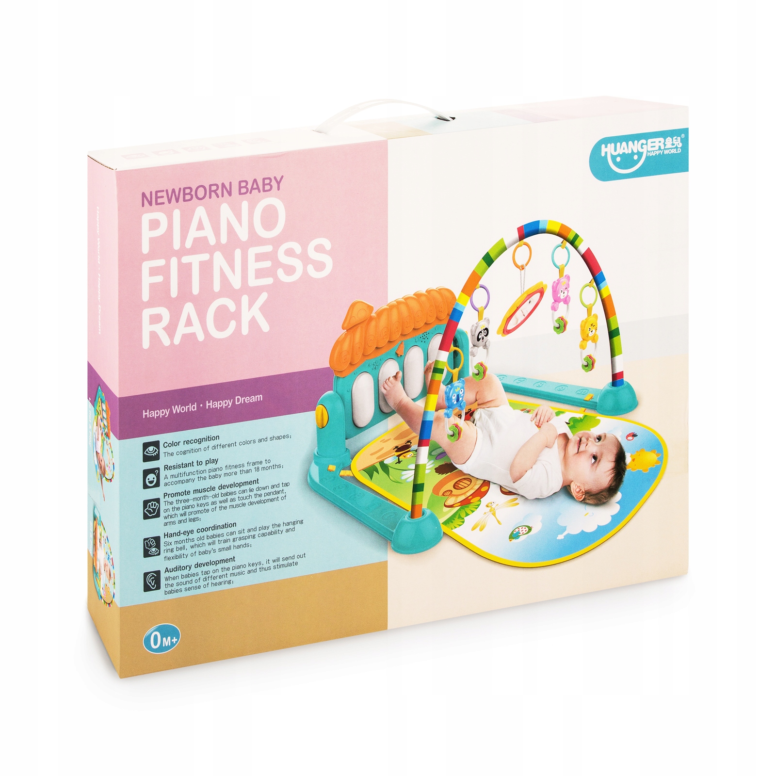 - (0-12 місяців) Піаніно з мелодіями можна використовувати з перших днів життя малюка. Прикріплений до поручнів ліжка, він служить музичною скринькою. Брязкальця, які висять на пов’язці, використовуються для ігор, і дитина може дивитися на себе в дзеркало.