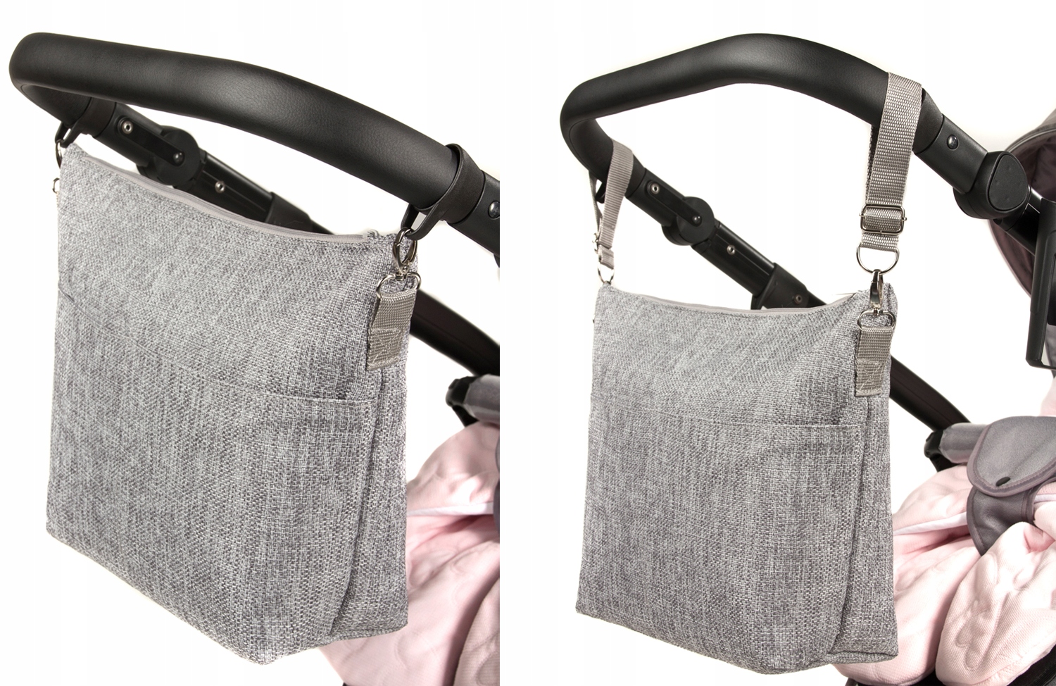Органайзер має регульований ремінь і сучасні дві системи кріплення на ручці коляски за допомогою карабінів і універсальних гачків (лямки входять в комплект)