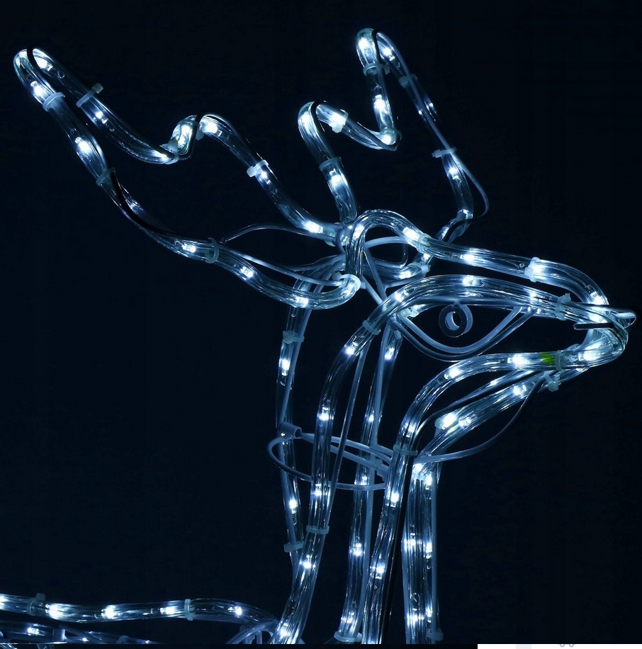 Міцне, гнучке покриття легкого ланцюга має товщину майже 9 мм, а клас IP44 - це параметр, який вказує на те, що ви можете легко розмістити оленів як всередині, так і зовні будинку - в саду, на терасі, балконі. У набір також входять металеві кілочки, за допомогою яких можна прикріпити оленя і сани до землі. Стійка металева конструкція забезпечує постійну форму установки.