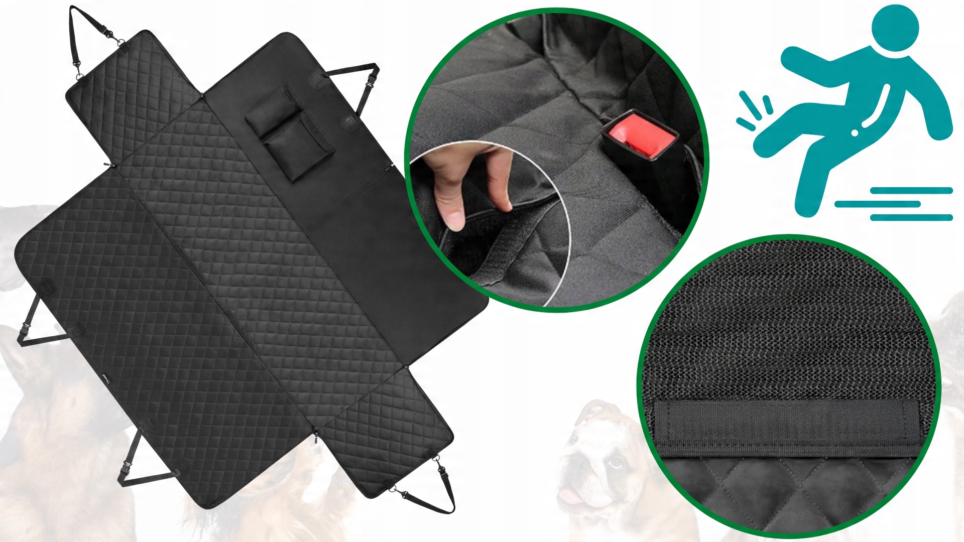 - ✅Отвори для ременів безпеки - килимок має два отвори, закриті липучками для розміщення тримачів ременів безпеки