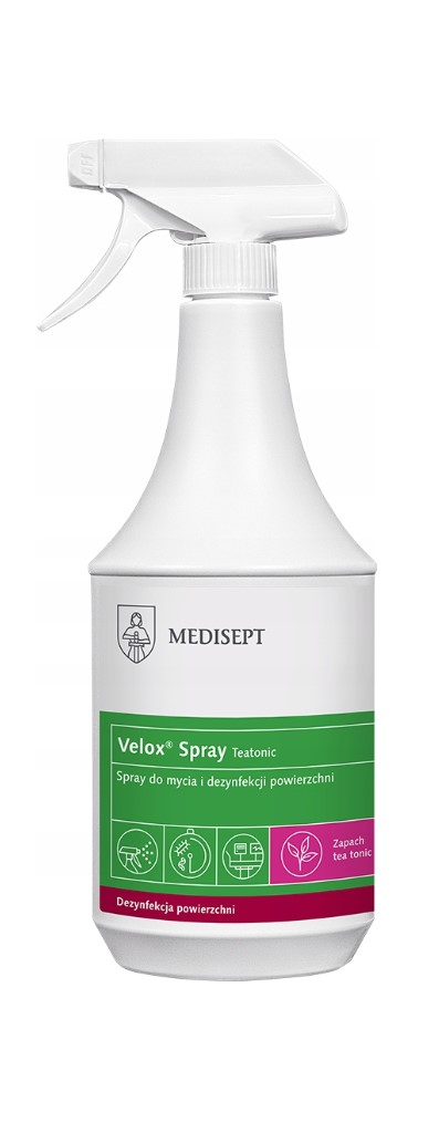 ⭐ Velox Spray - рідина для швидкої дезінфекції невеликих поверхонь у медичних закладах, будинках престарілих, санаторіях, фітнес-салонах та SPA b>, перукарень і салонів краси, масажних салонів, дитячих садків, шкіл і для дезінфекції поверхонь, які контактують з їжею або без неї. Підходить для дезінфекції поверхонь, таких як стільниці, столи, дверні ручки, ручки, перукарське та косметичне обладнання та аксесуари, а також неінвазивне медичне обладнання, таке як крісла для лікування, медичне обладнання, реабілітаційне обладнання.