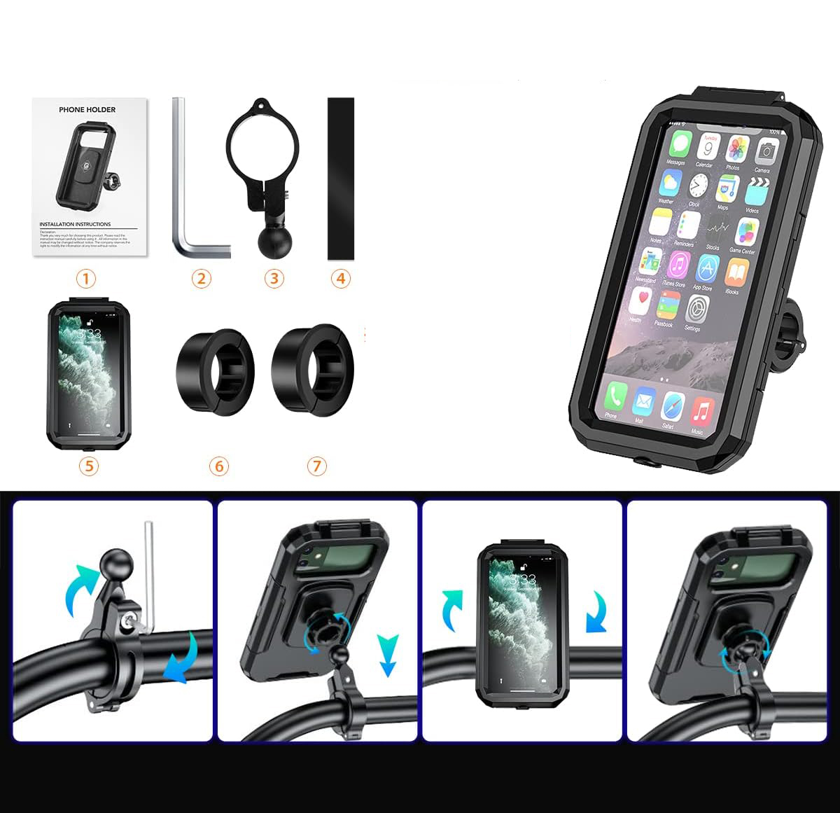 🚴♀ 【Конструкція, стійкий до погодних умов】 Власник телефону водонепроникний та пилозахисний, а набір також включає водонепроникні навушники та розетку для завантаження. Власник телефону забезпечує повний захист смартфона від дощу, пилу, снігу та бризок. Підставка для мотоциклів виготовлена з ABS + довговічного ПВХ пластику. Останній власник телефону мотоцикла - найкращий друг та подарунок для кожного мотоцикліста.