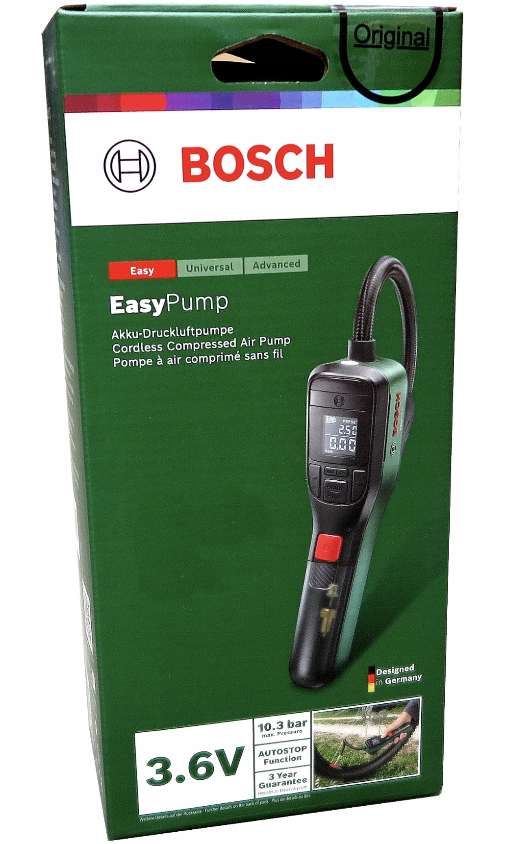 bosch easypump - це сучасний електричний насос з високою продуктивністю , створеною для зручності використання . Завдяки автоматичному вимкненню , точного вимірювання тиску та компактний дизайн буде працювати в кожній ситуації. Ідеально підходить для домашнього використання, під час велосипедних поїздок , а також для насосних спортивних кульок, матраців та інших аксесуарів .