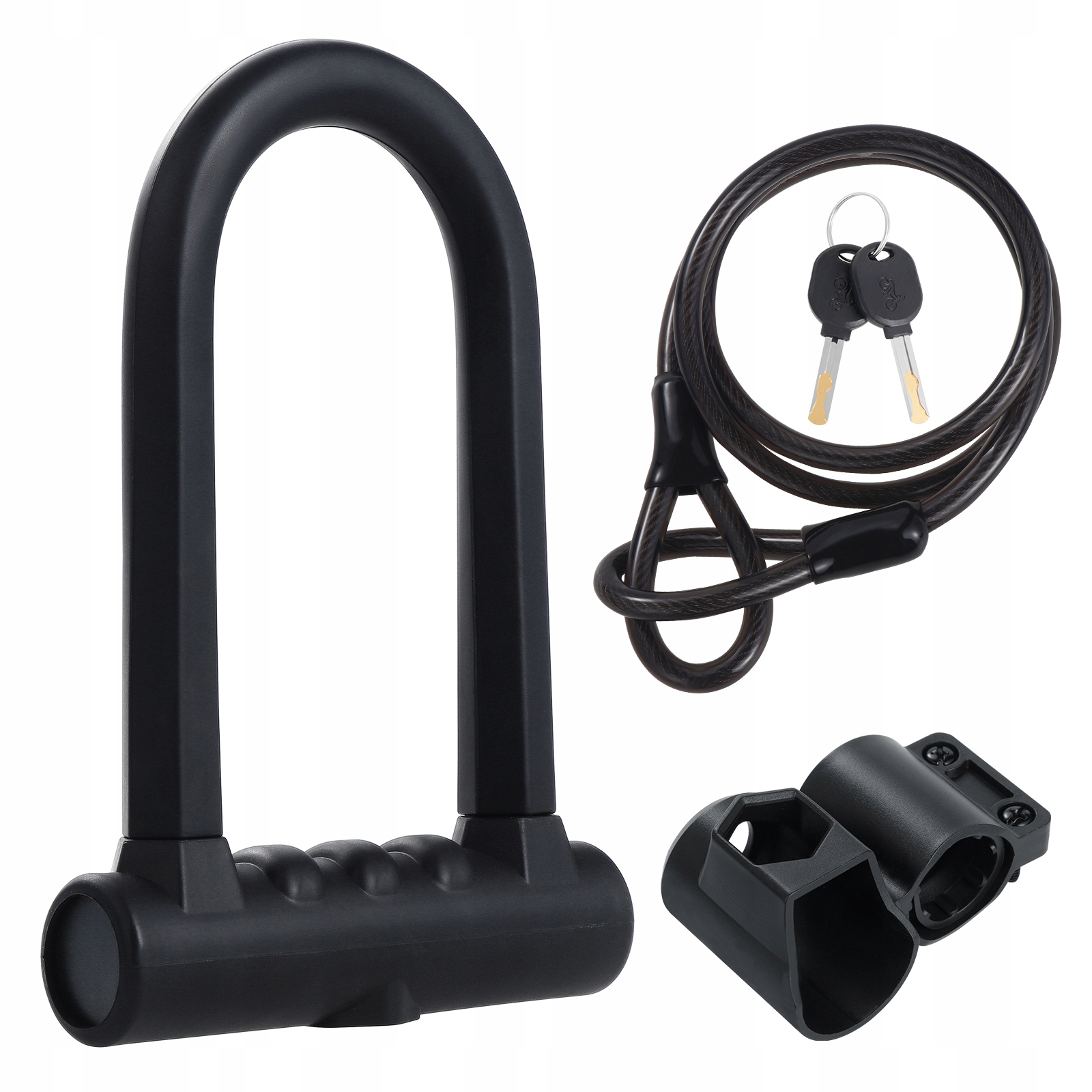 - Сталевий трос довжиною 125 см забезпечує подвійний захист від крадіжки. (Примітка: трос є лише допоміжним замком; лише U-подібний замок є стійким до порізів, а U-подібний замок має блокувати колеса).