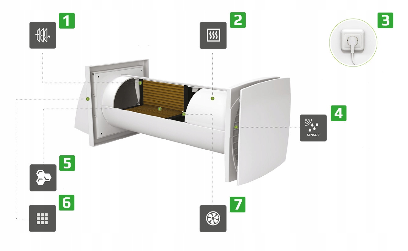 Рекуператори VENTIKA SOLO+ забезпечують ефективну, енергозберігаючу постійну вентиляцію окремих приміщень, мінімізуючи тепловтрати, фільтруючи припливне повітря та підтримуючи належну вологість повітря. Для монтажу безпосередньо в зовнішню стіну.