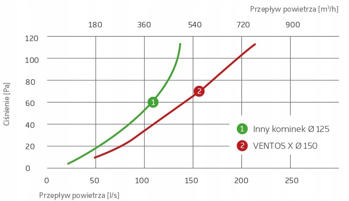 діаграма показує порівняння потоку повітря через вентиляційний камін з діаметром 125 та 150 мм.