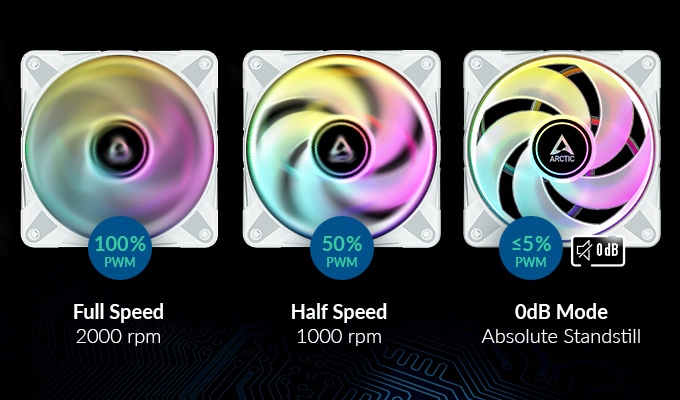 Робочий шум нещодавно розробленого двигуна ARCTIC ледве чутний навіть на найнижчій швидкості. Крім того, P12 PWM PST RGB має прогумовані контактні поверхні, що зводить до мінімуму чутні вібрації.