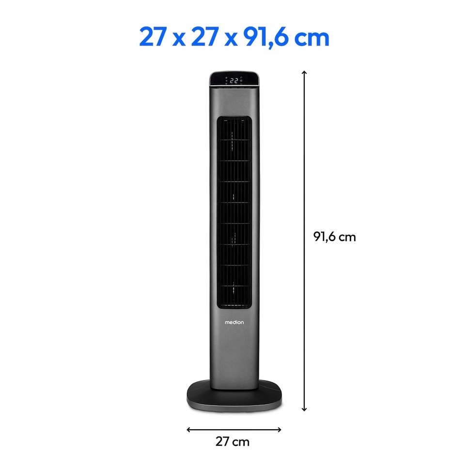 вентилятор німецького медіонів (вежа) завдяки його розмірам (висота 91 см) має більшу силу удару з меншою швидкістю. Завдяки таким розміром вентилятор тихіший, ніж менші версії. Сезон під час високих температур та ситуацій, коли повітря в кімнатах сушиться під час опалення, а широкий спектр функцій означає, що він знайде багато додатків. Панель управління або за допомогою пульта дистанційного керування.