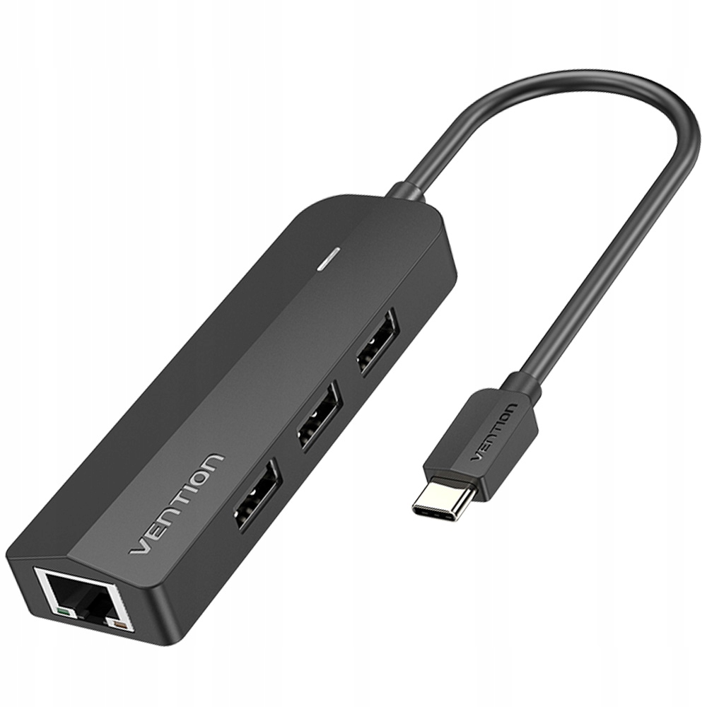 - USB-концентратор Vention містить три порти USB 2.0, один порт Micro USB і порт RJ45