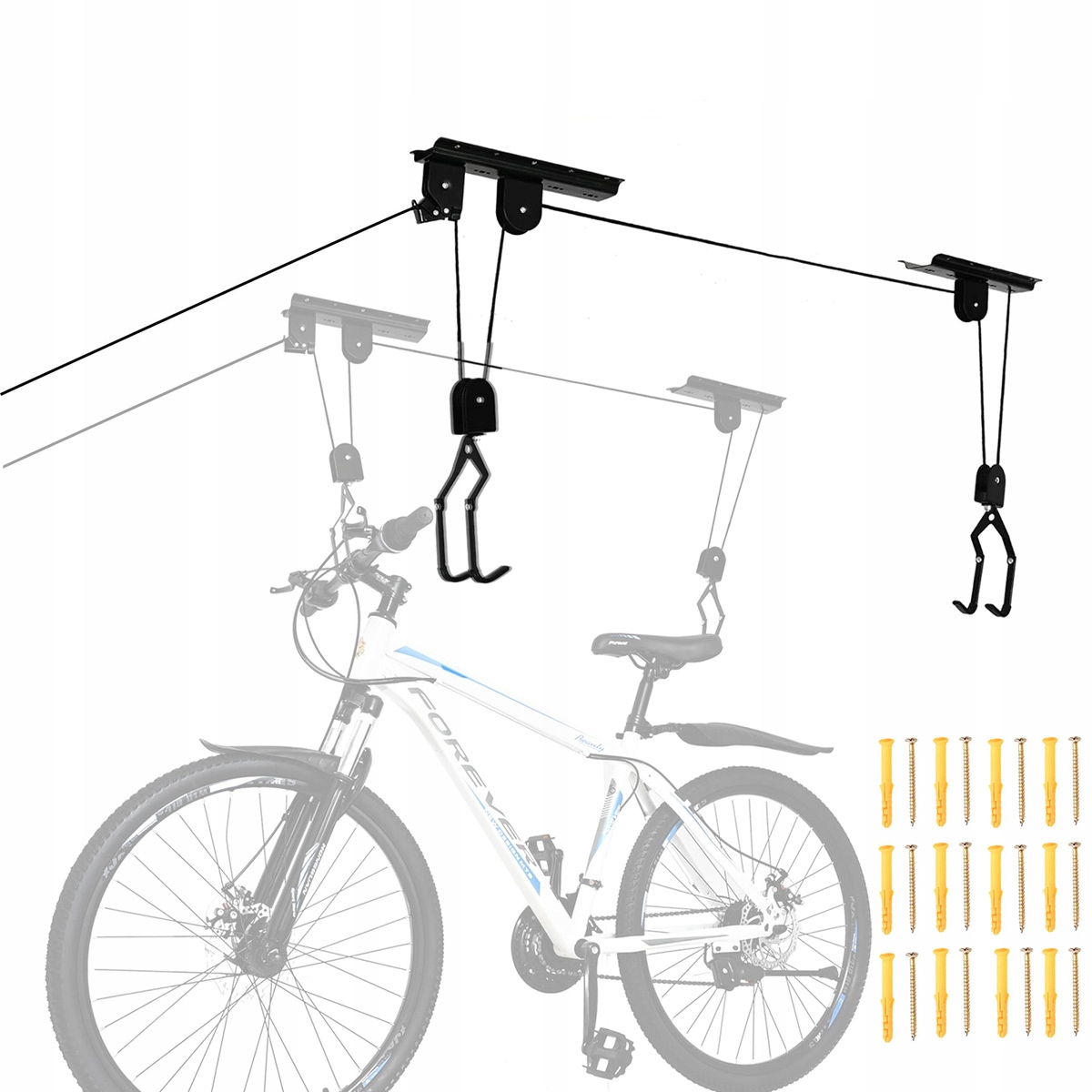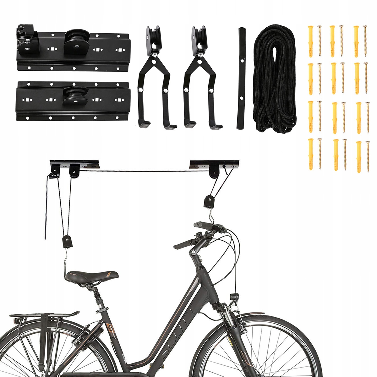 safely storage of equipment out of season - with the help of two hooks (put on a saddle and the steering wheel) and the attached to the set, easily and quickly worship your bike under the ceiling, in this way, you save your bike under the стеля. в гаражі або майстерні. У наборі ви знайдете всі необхідні елементи для встановлення вішалки.
