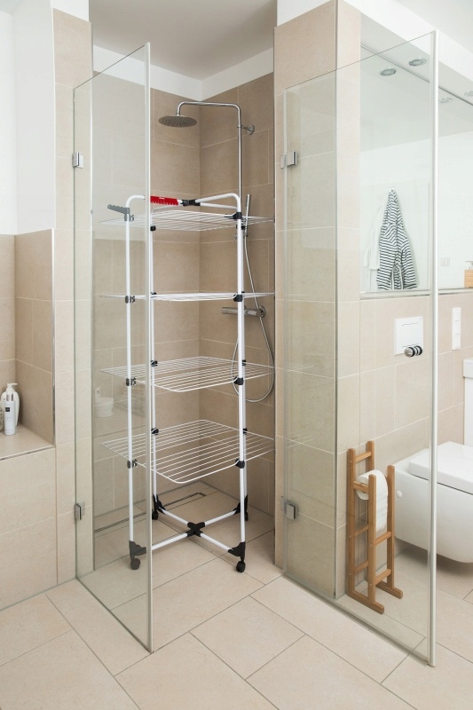 Компактні розміри дозволяють розмістити сушарку з білизною, наприклад, у душі (з діагоналлю не менше 100 см), а коли у складеному стані, це полегшує зберігання. Стійка до корозії та міцна конструкція гарантує тривале використання.