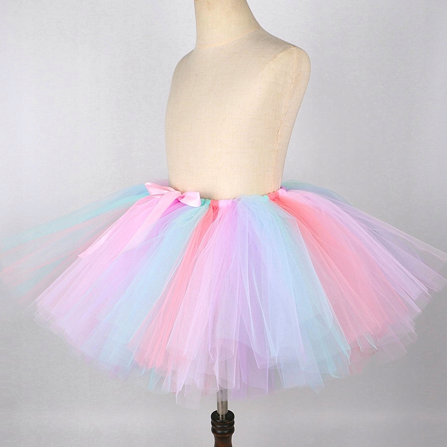 - Спідниця складається з кількох шарів різнокольорового тюлю,