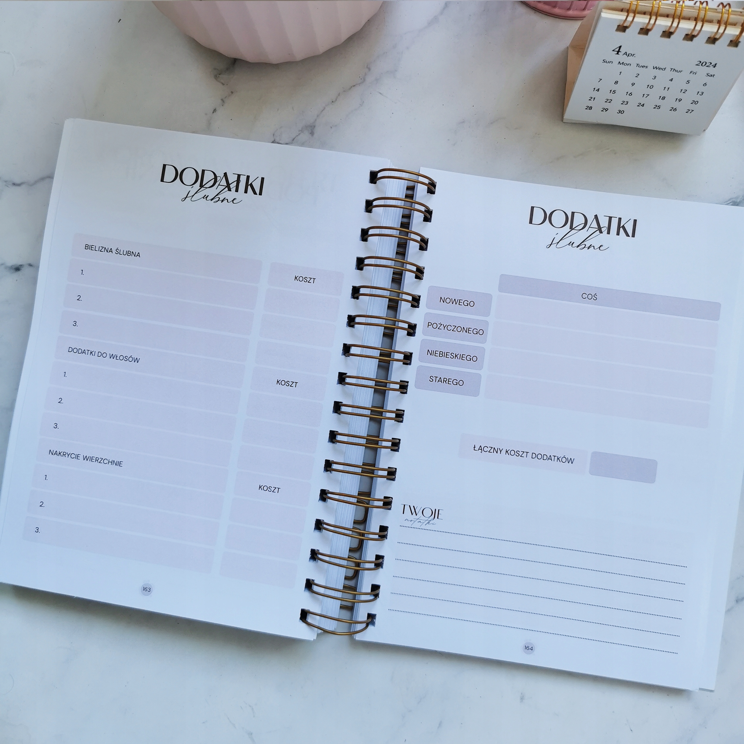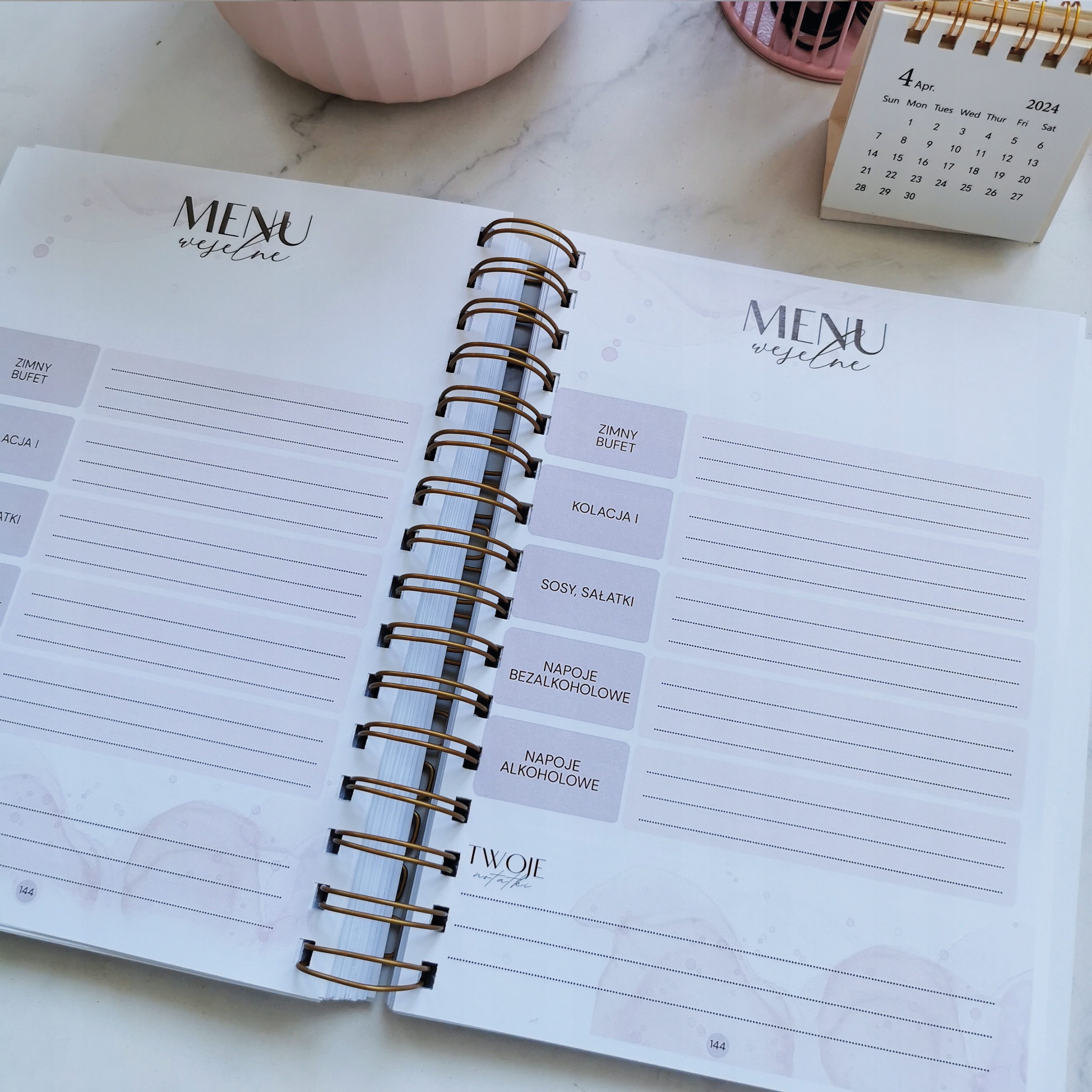- Весільний планувальник з елегантною м'якою обкладинкою, з'єднаний золотою спіраллю з листівками