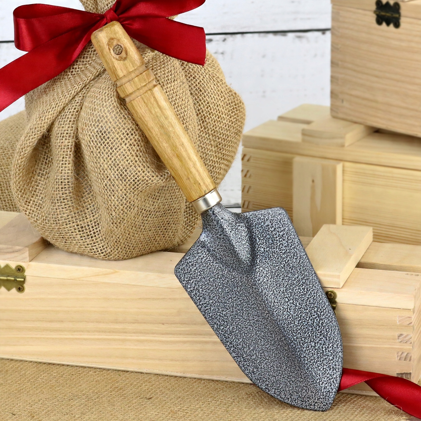Скриня b> коричневого кольору, виготовлена з деревини сосни і має міцну ручку-струну, закривається на дерев'яну засувку. Всередині, звичайно, буде дерево в декорованому горщику та лопата з нержавіючої сталі.