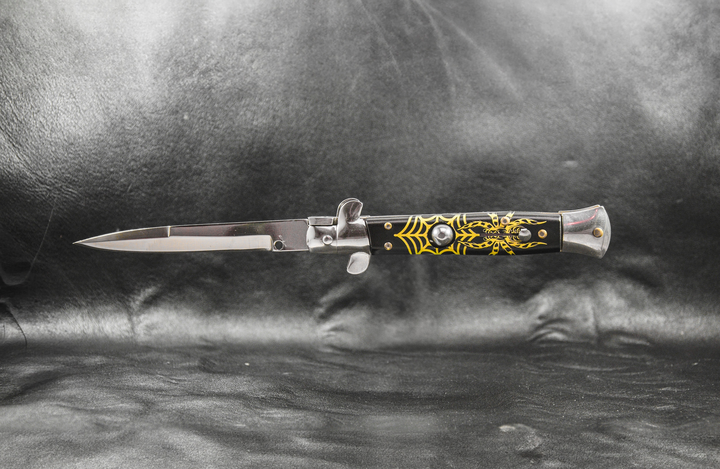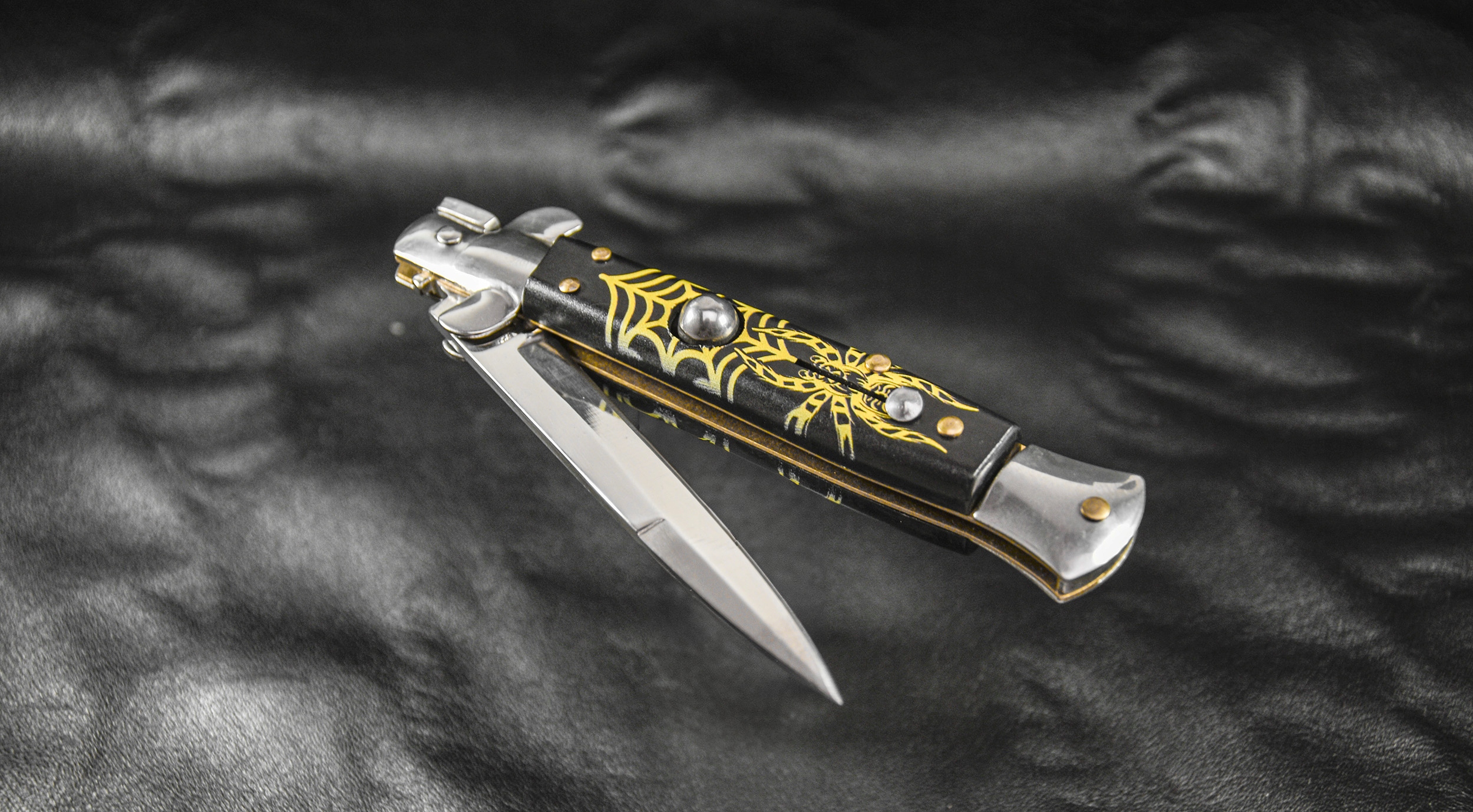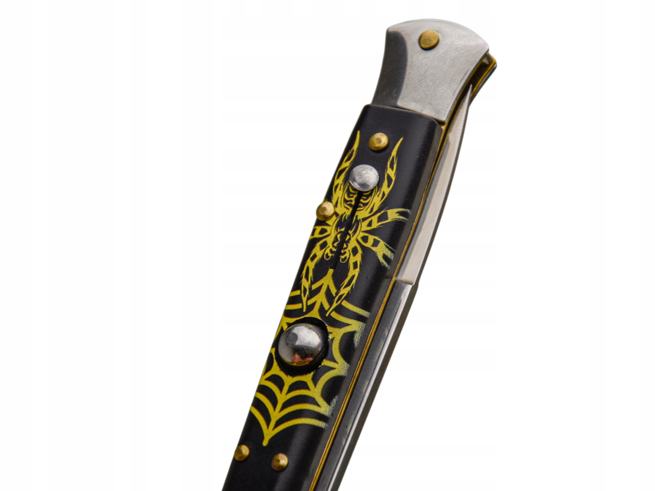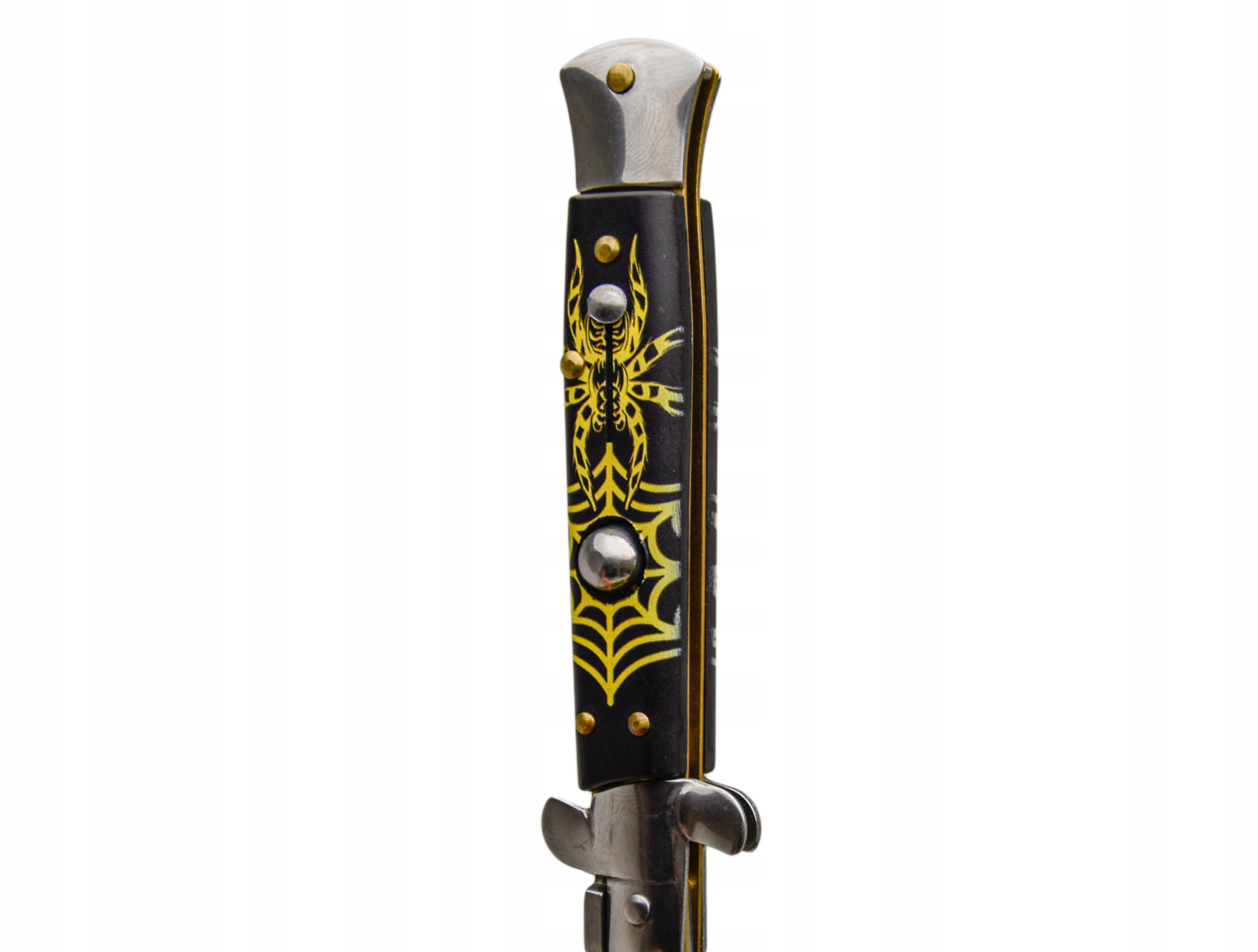 - Чорна ручка цього унікального італійського весняного ножа представляє чудову графіку, яка, безумовно, привертає увагу. У центрі є реалістично зображений павук з павуковою мережею, що надає ножем унікальний і, безумовно, характерний вигляд.