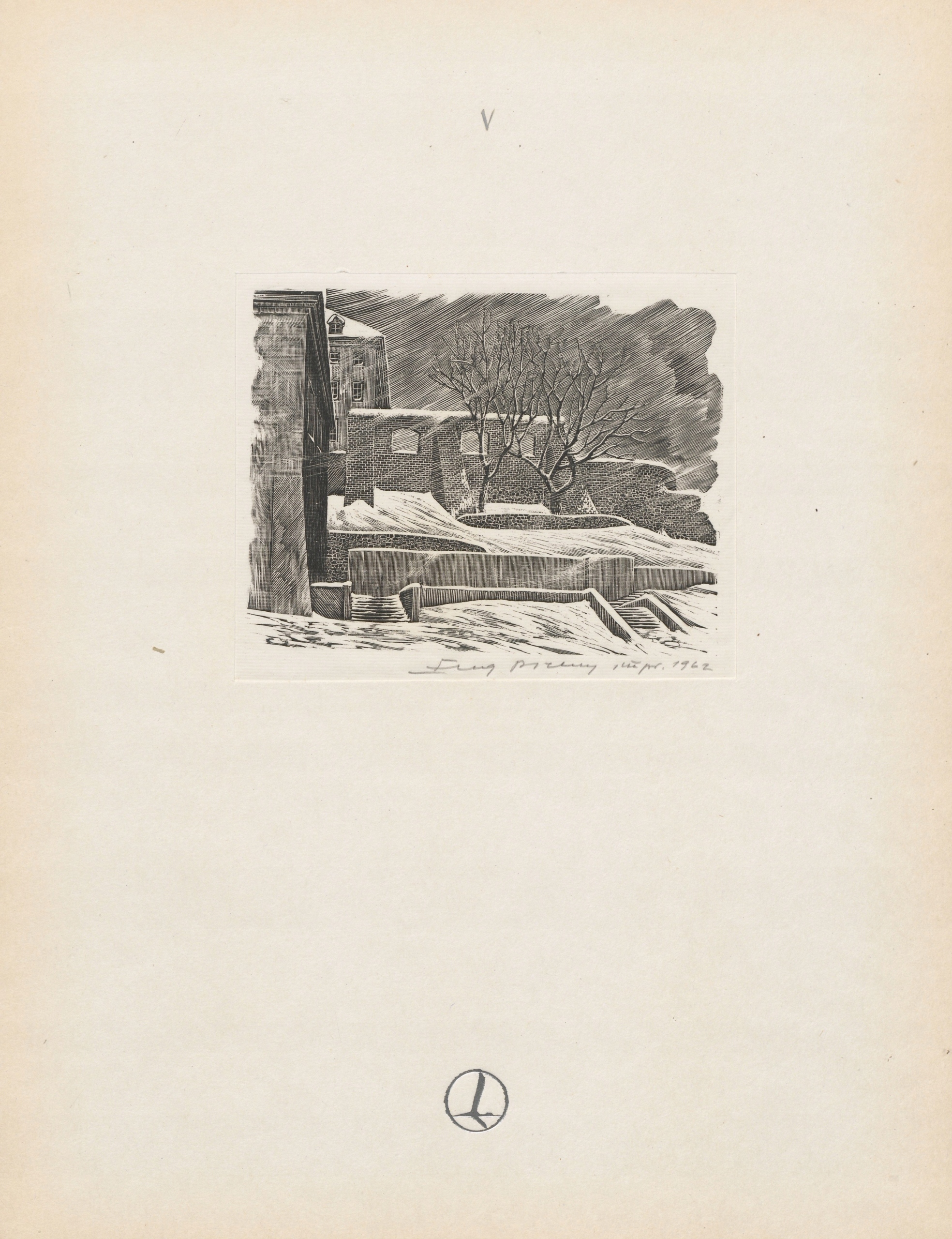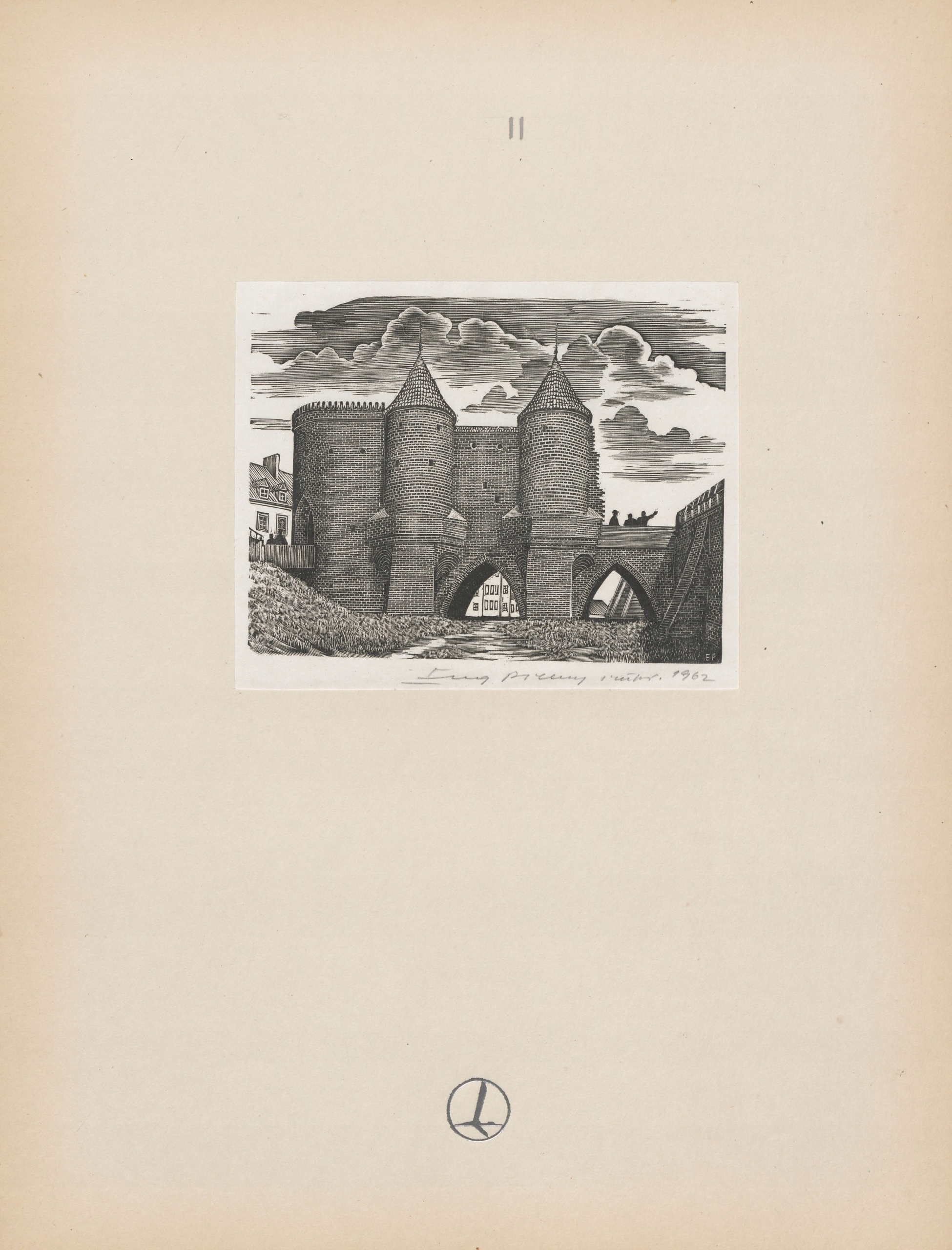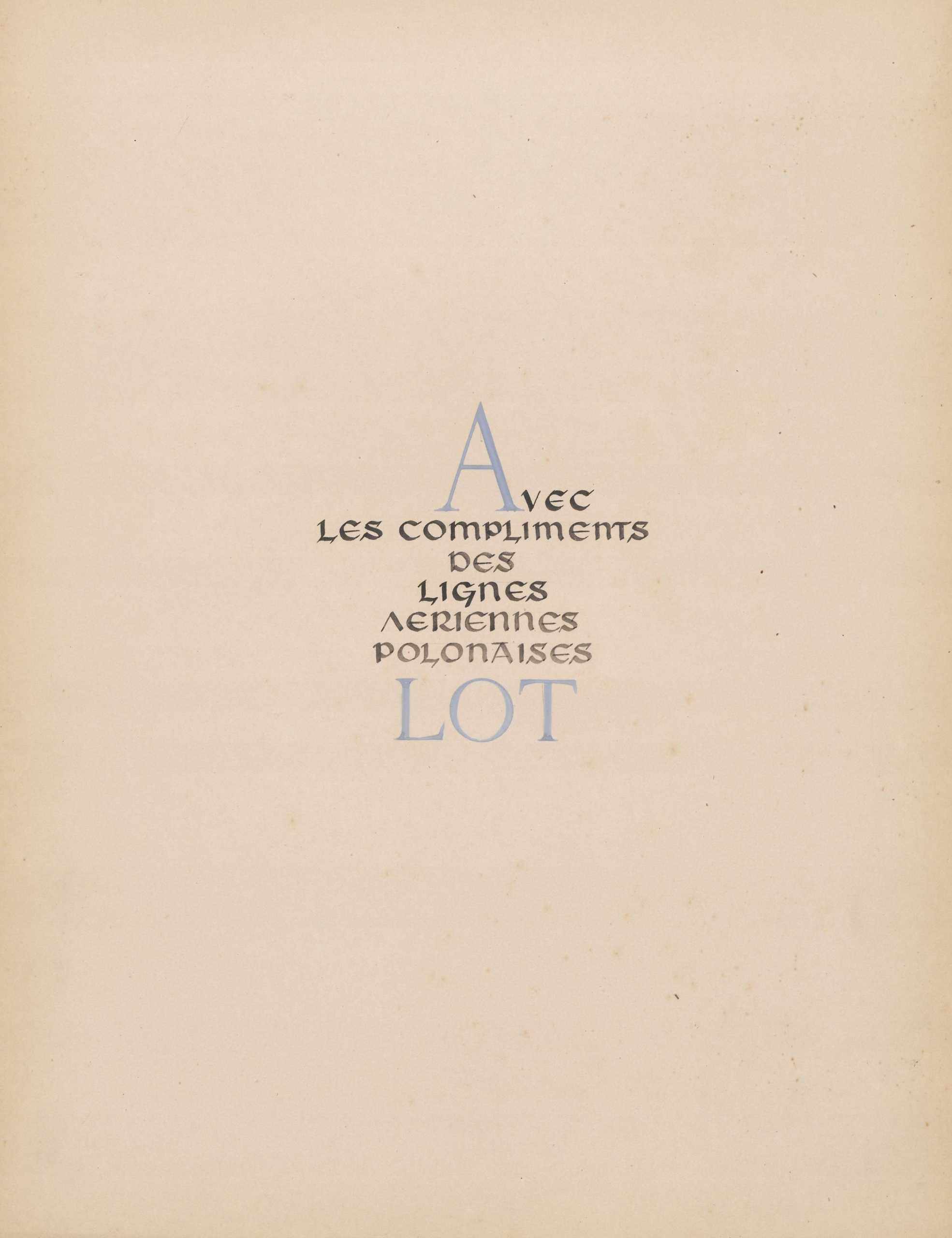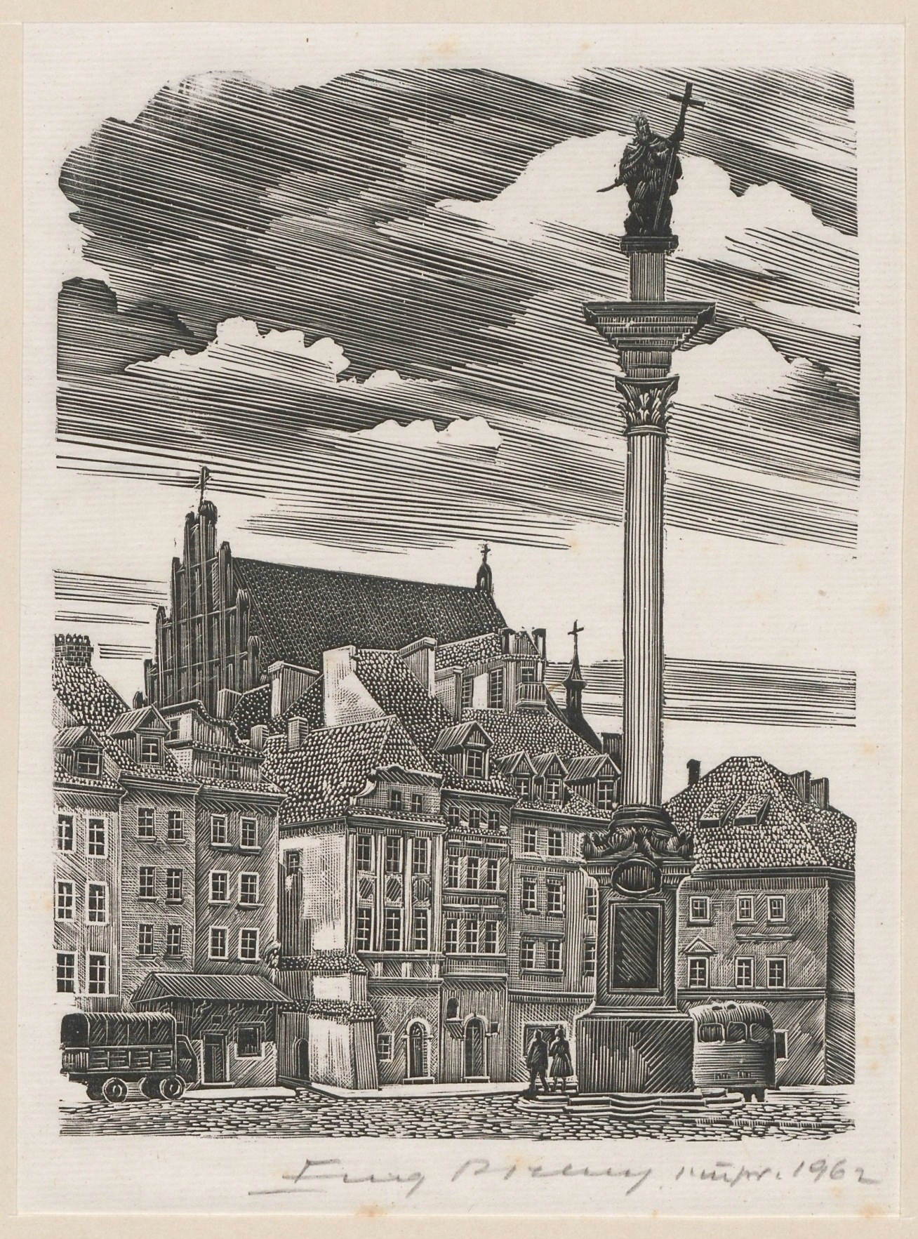 Варшава 1962. 32,5x43 см. Портфоліо з 6 гравюрами на дереві із зображенням Варшави роботи Євгеніуша Пічелла. Твори підписані та підписані автором. Список гравюр на дереві, написаних від руки. Ксилографії на бланку польських авіаліній. На ксилографії зображено: