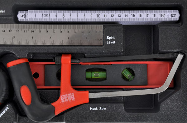 У набір входять: Лінійка кутова: 2м, Лінійка складна: 25*14см, Ватерпас: 9", Ручна пила: 6", Мірна стрічка: 3"