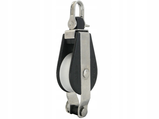 Однопідшипниковий шків з нержавіючої сталі з шарніром, гаком і міцним пластиковим роликом. Параметри:
