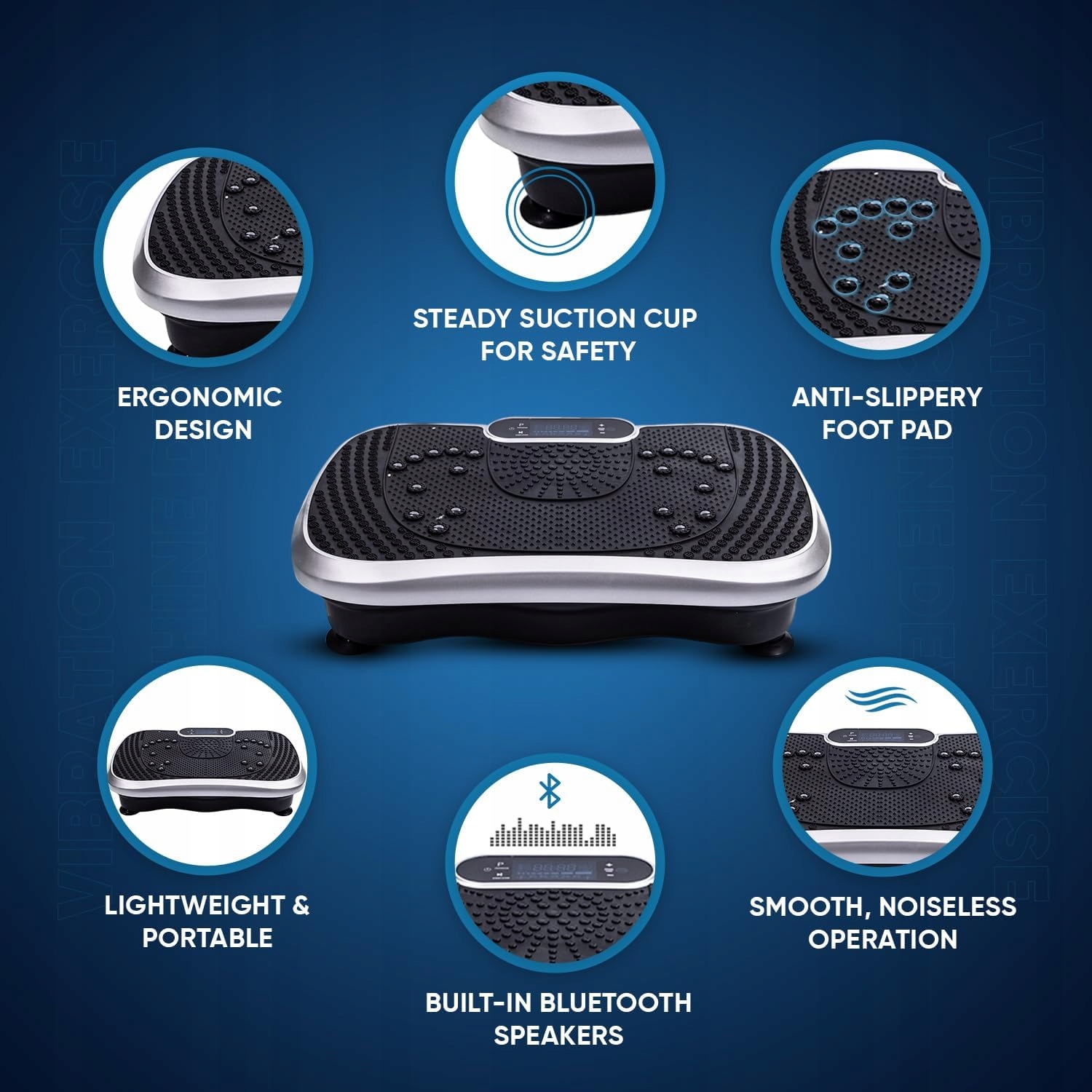 Високоякісні матеріали та якість продукції - фітнес -вібраційна пластина виготовлена з високоякісних матеріалів, що забезпечують найкращу якість та довговічність. Наш альбом Vibration - ідеальна підтримка вашої інтелектуальної підготовки. Спортивне обладнання з усіма хорошими функціями - вібраційна дошка Weightworld важить 7,5 кг і займає мало місця. Він також оснащений дистанційним керуванням та світлодіодним дисплеєм. Ви також можете насолоджуватися улюбленою музикою завдяки вбудованим динамікам Bluetooth. Завдяки поверхні не -ковзання стопи, пластина забезпечує найвищий комфорт використання. Має тонку і практичну форму і його легко зберігати.