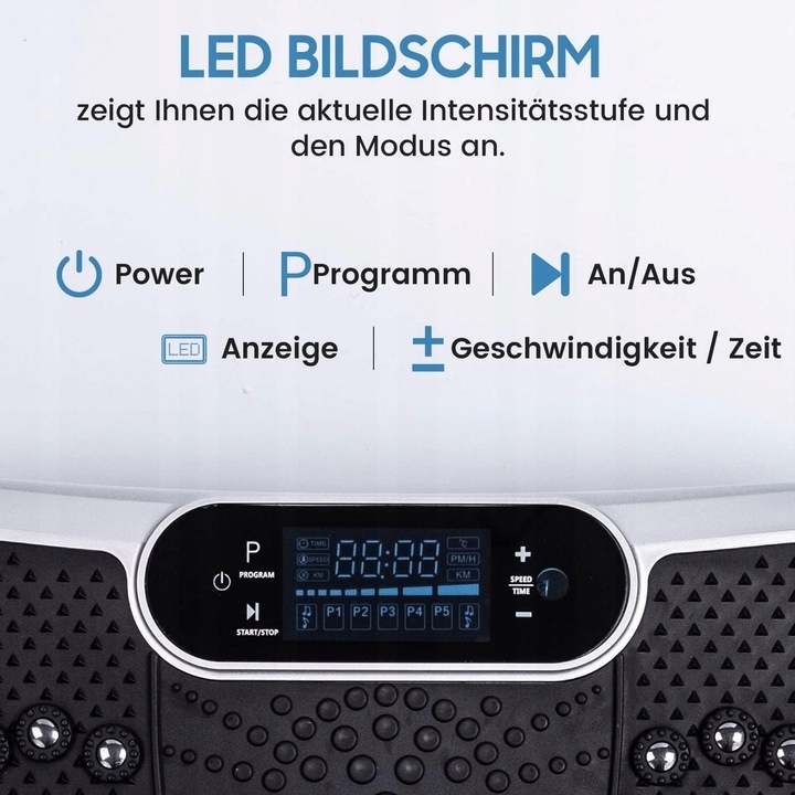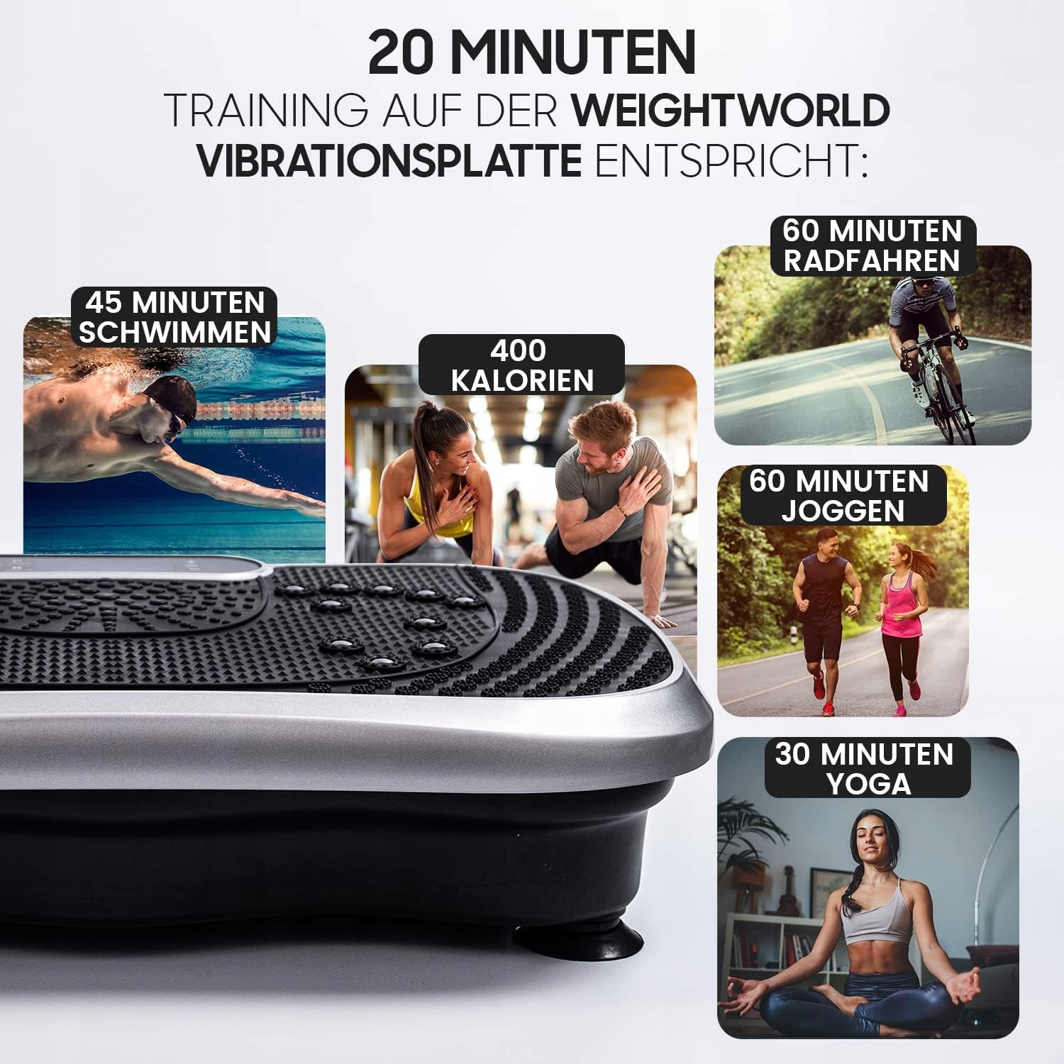 обладнання для домашніх вправ - користь, наприклад, поліпшення гнучкості, розслаблення м’язів, рівновага, кровообіг та поліпшення метаболізму без використання занадто багато часу та енергії. Завдяки нашому фітнес -техніці ви можете продовжувати тренуватися вдома. Ви досягнете ефекту спорту на свіжому повітрі за 20 хвилин. Ви можете відстежувати прогрес та час навчання на світлодіодному дисплеї та вибрати режими, що відповідають потребам навчання. 99 Рівень інтенсивності та 6 режимів тренувальних функцій - насолоджуйтесь навчанням вдома, адаптованим до ваших потреб завдяки нашому вібраційному навчальному пристрої. Наш фітнес -пристрій має 99 рівнів інтенсивності та 6 програм для індивідуально адаптованої підготовки вдома. Ви отримаєте 5 додаткових фітнес -груп, британських та європейських плагінів та пару смуг опору. Цей фітнес -пристрій також можна використовувати як масажер. Вібраційна пластина Weightworld з багатьма перевагами - досягайте своїх фізичних цілей за допомогою вібраційної пластини Weightworld. Вібрації тарілки стимулюють різні м’язові групи по всьому тілу. Це підтримує вашу підготовку з точки зору глибокої структури м’язів та рівня придатності. Спортивні тренування також захищають суглоби та роблять тіло більш еластичним. Вібраційна пластина має напругу від 50 до 60 Гц. Цей пристрій має обмеження ваги 120 кг.