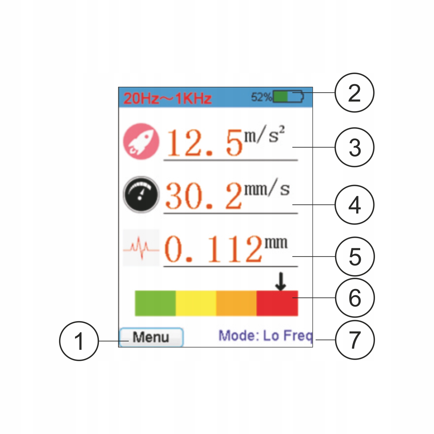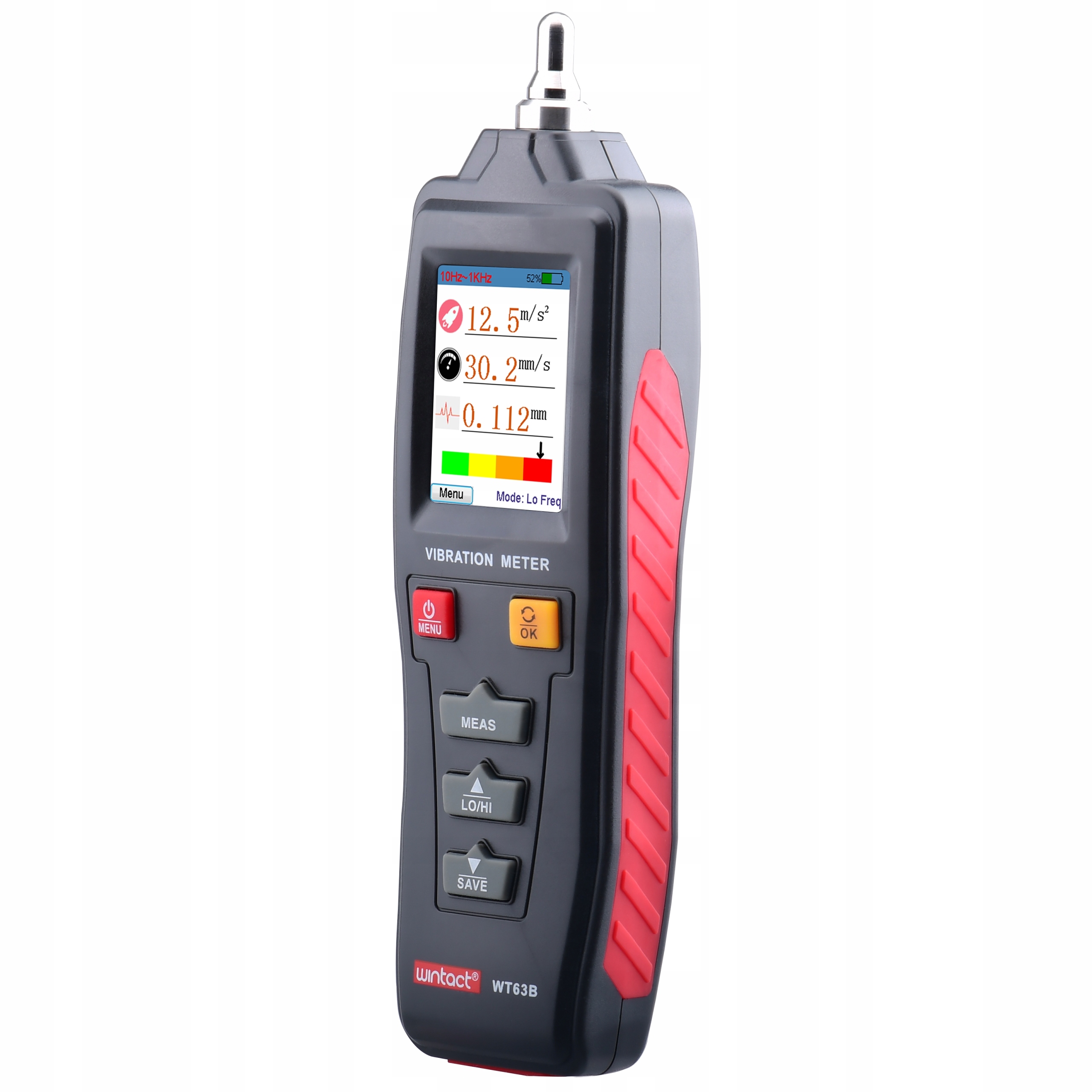 - Діапазон частот для вимірювання прискорення: Висока частота: 1KH - 15KHz (HI) Низька частота: 20Hz - 1kHz (LO)