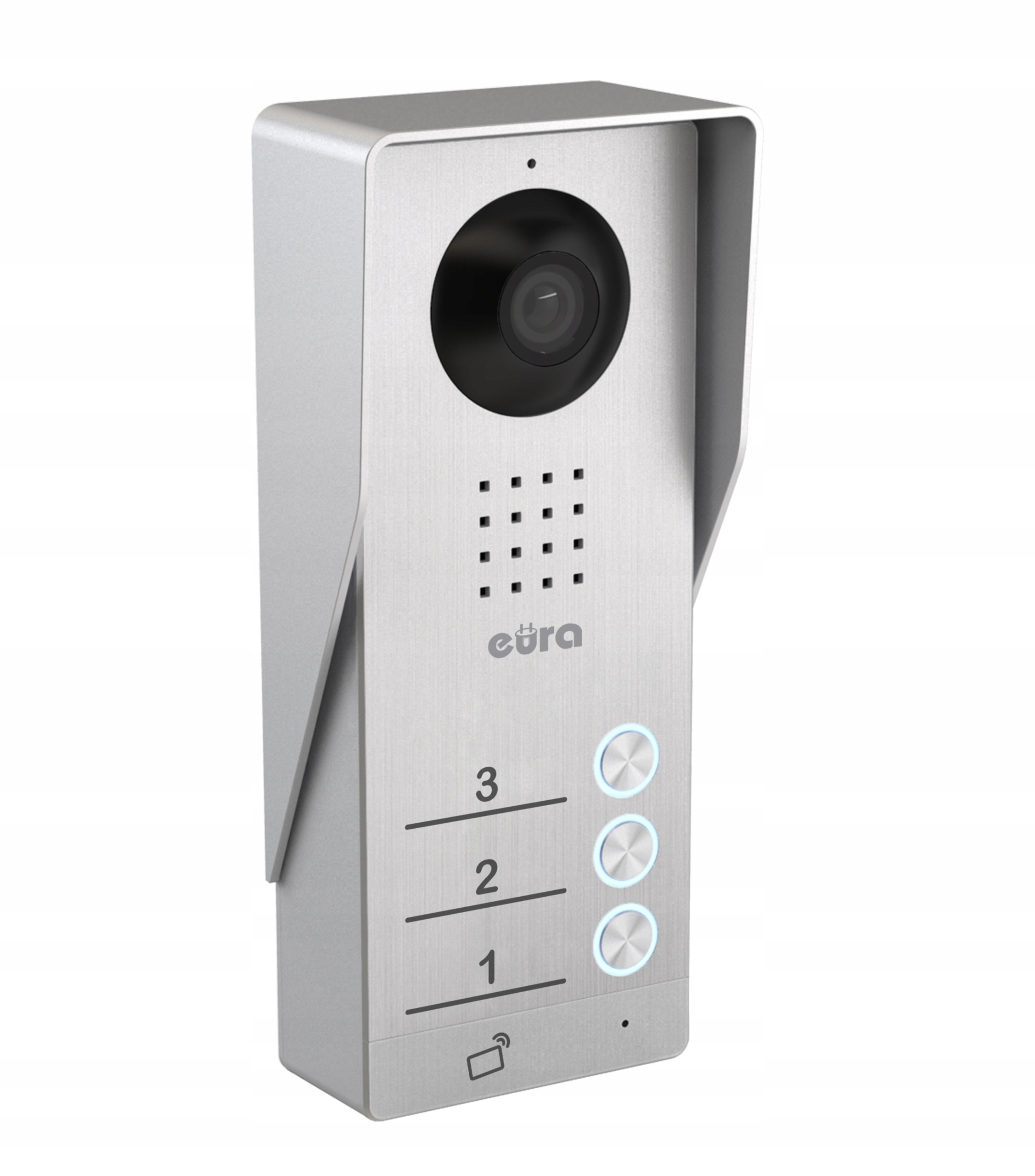 Трьохсімейна зовнішня станція Eura VDA-93A3 оснащена 6 світлодіодами у білому кольорі та датчик сутінків, що дозволяє непомітно переглядати вночі. Касета оснащена камерою запису зображення з роздільною здатністю 500 ТВЛ з об'єктивом з кутом огляду 60°. Вхід до помешкання можливий за допомогою безконтактних брелоків.