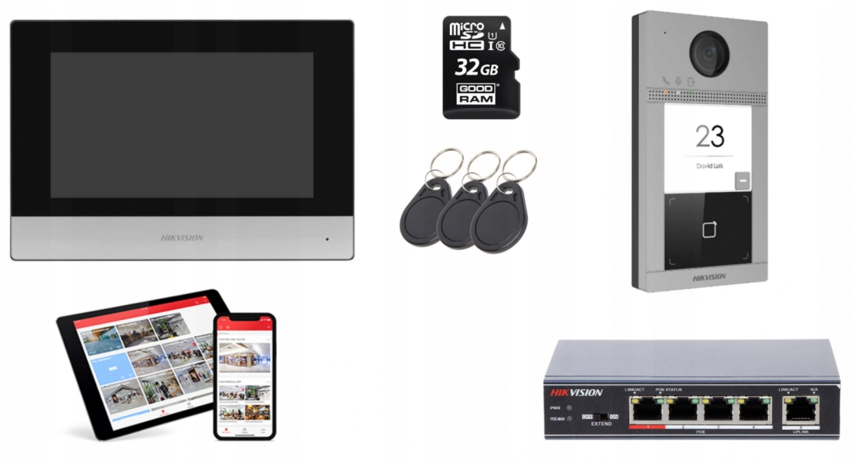 - Воротна станція DS-KV8113-WME1 Hikvision з 2 Мпікс камерою FullHD і проксімітіратором, що дозволяє голосовий зв'язок і відкриває ворота за допомогою картки або брелок Внутрішній монітор DS-KH6320-WTE1 Hikvision, що дозволяє контролювати відкриття воріт, перегляд зображення з камери та віддалений доступ через смартфон додаток