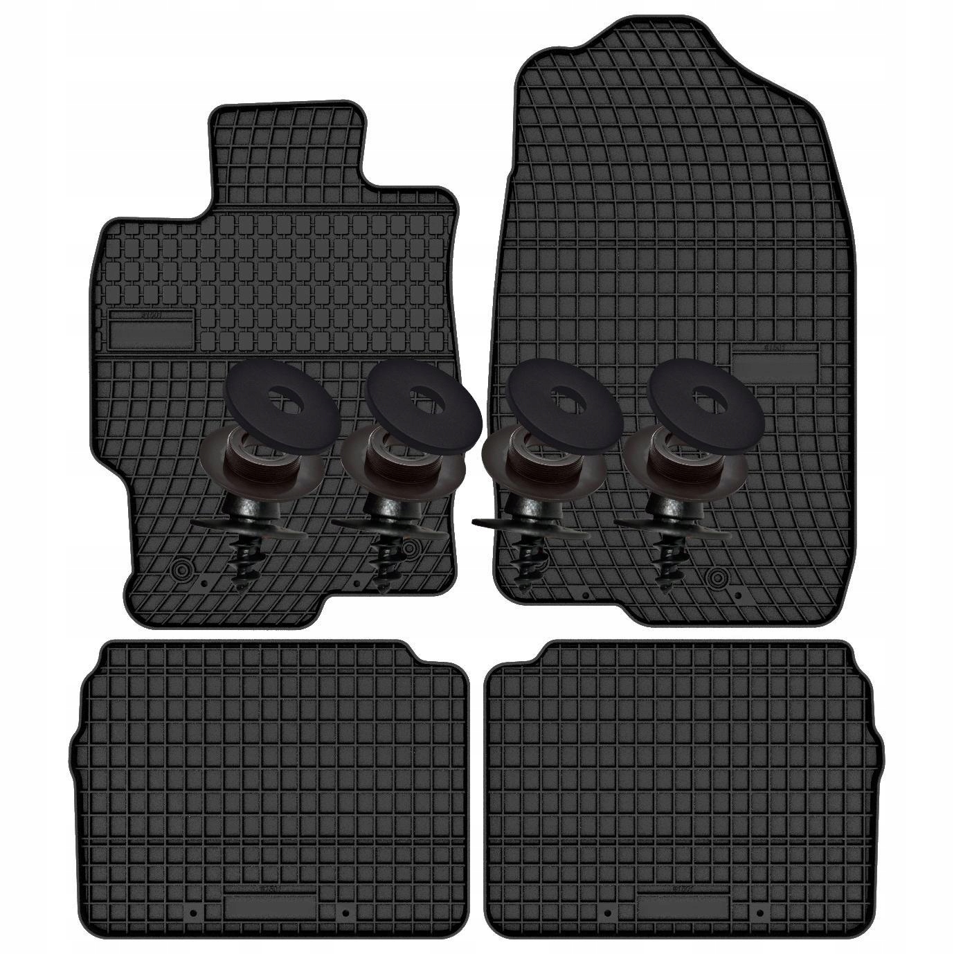 Кожний передній килимок постачається з 2 наборами стопорів і відповідних гвинтів, які видно на фото нижче (один комплект складається з 1 нижньої частини стопора, 1 нижньої частини стопора та гвинта). Стопори та шурупи упаковані в пакети по 2 комплекти (один пакет на один килимок). Стопори необхідно встановити самостійно. На килимках не позначені місця кріплення стопорів, будь-які запропоновані місця встановлення слід уважно перевіряти, оскільки в деяких версіях автомобілів ці місця можуть бути переміщені. Встановлення стопорів не є необхідним для належного використання килимків. Килимки дуже важкі та відносно товсті - вага одного переднього килимка, залежно від моделі, становить приблизно 2 кг - і вони додатково мають виступи на дні, які самі по собі добре прилягають до поверхні без будь-якої тенденції до переміщення. Стопори є лише додатковим елементом, який захищає килимок від переміщення.