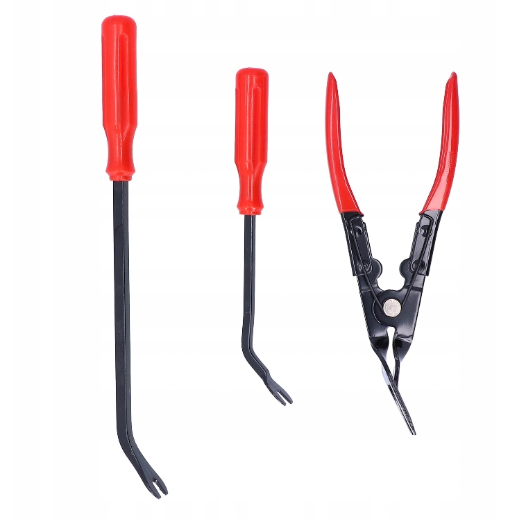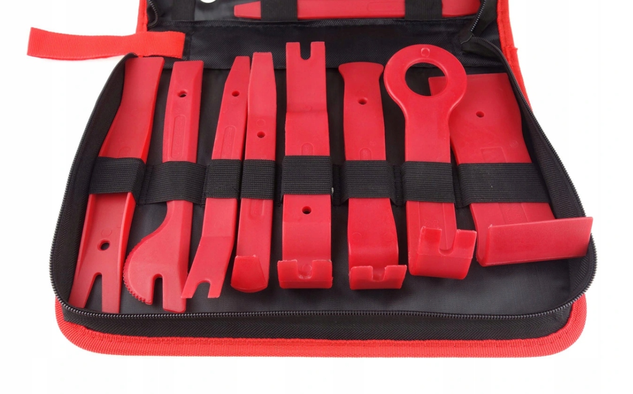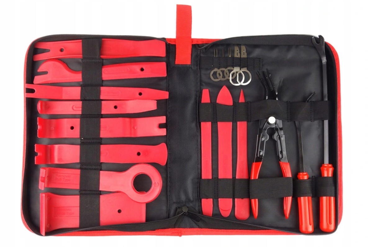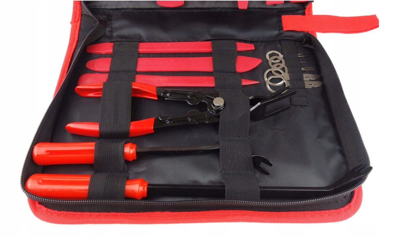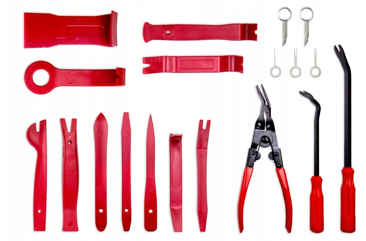 Професійний набір оббивних важелів і знімачів, різних типів шпильок і кліпс. Завдяки йому ми можемо легко та безпечно демонтувати елементи обшивки салону автомобіля, хомути, хомути, штифти, перемикачі, дверні панелі тощо.